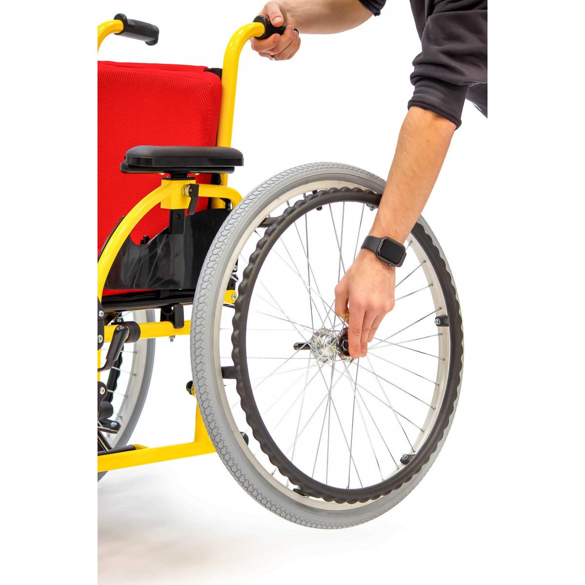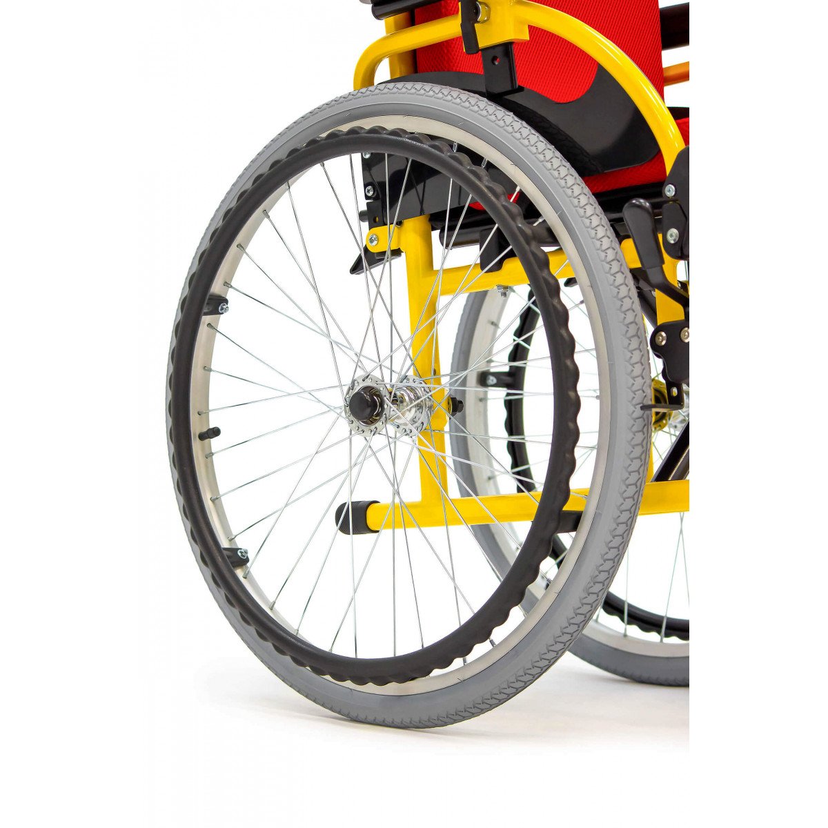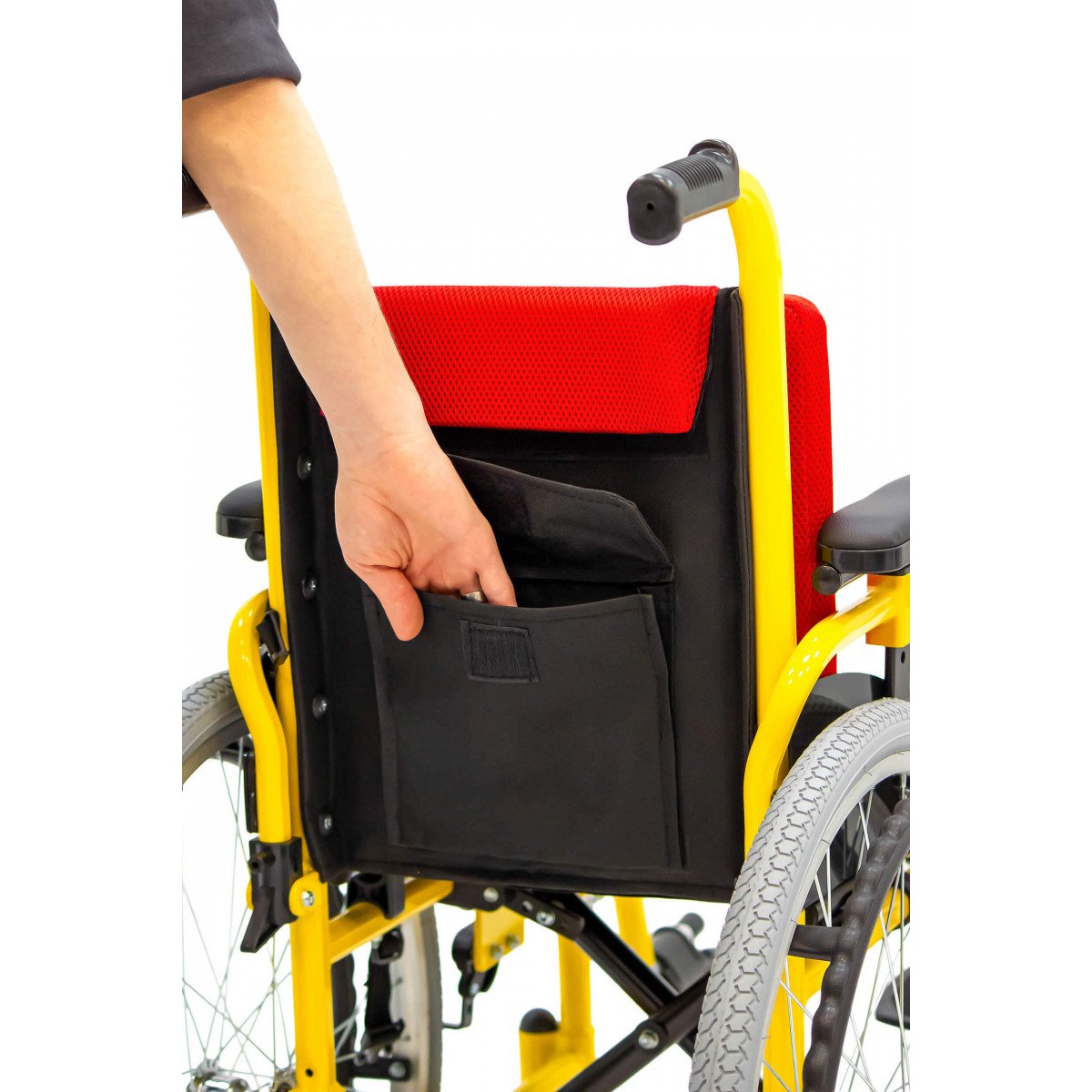 Пневматические задние колёса обеспечивают мягкий ход, а передние литые колёса не требуют обслуживания и добавляют устойчивости. Для фиксации на месте предусмотрены боковые стояночные тормоза. На спинке расположен небольшой карман — в нём удобно хранить необходимые мелочи.