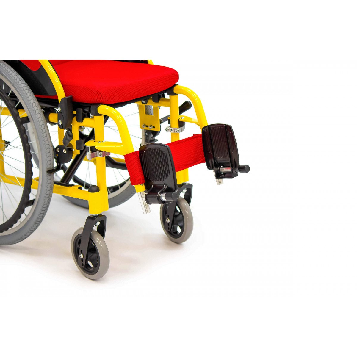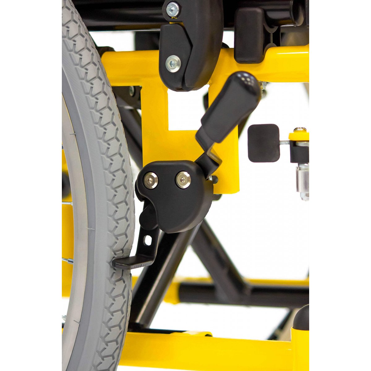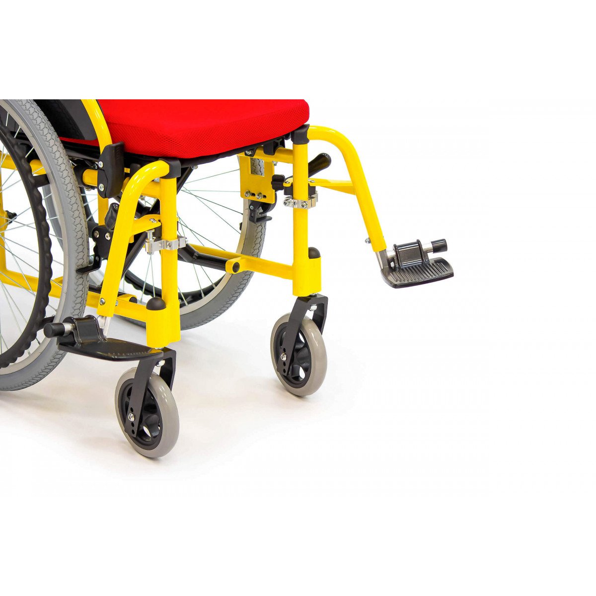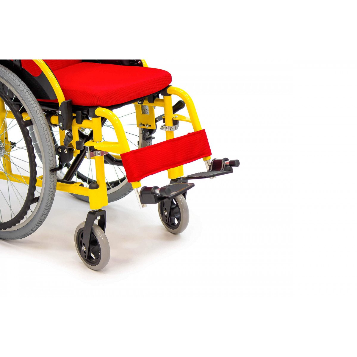 Пневматические задние колёса обеспечивают мягкий ход, а передние литые колёса не требуют обслуживания и добавляют устойчивости. Для фиксации на месте предусмотрены боковые стояночные тормоза. На спинке расположен небольшой карман — в нём удобно хранить необходимые мелочи.