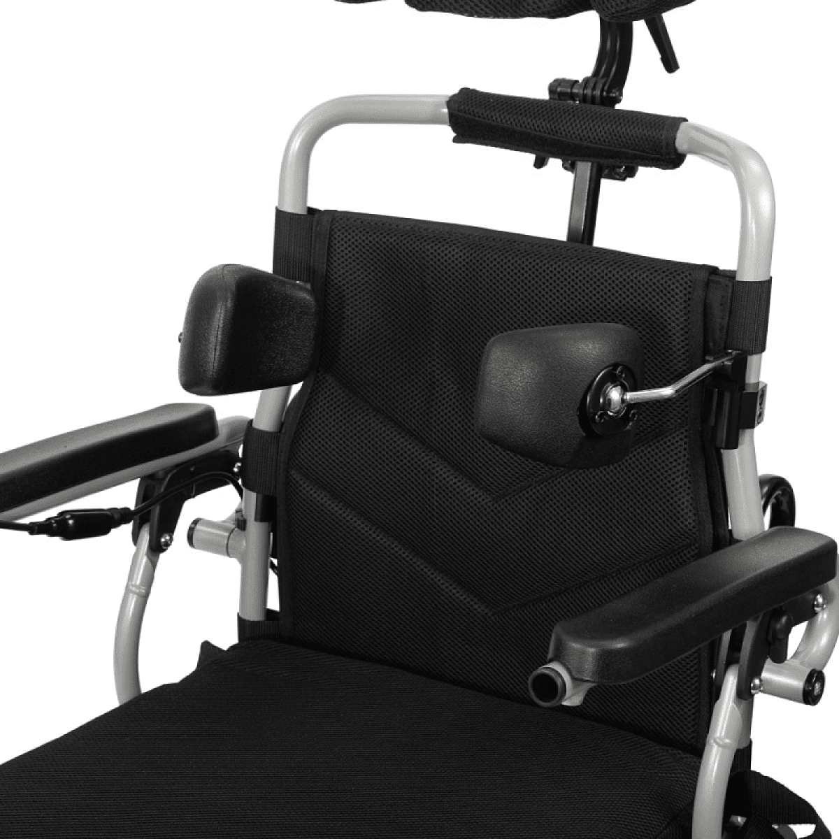 Коляска также оснащена рядом персонализированных функций для обеспечения максимального комфорта пользователя. Регулируемый подголовник позволяет индивидуально настроить поддержку головы и шеи, а боковые поддержки обеспечивают дополнительную стабильность и правильную позу сидя.