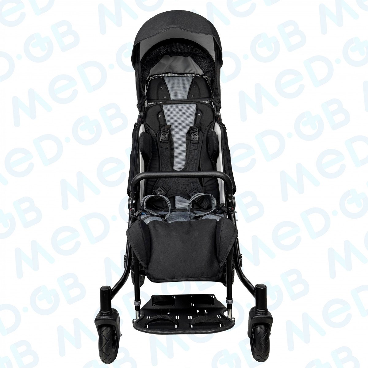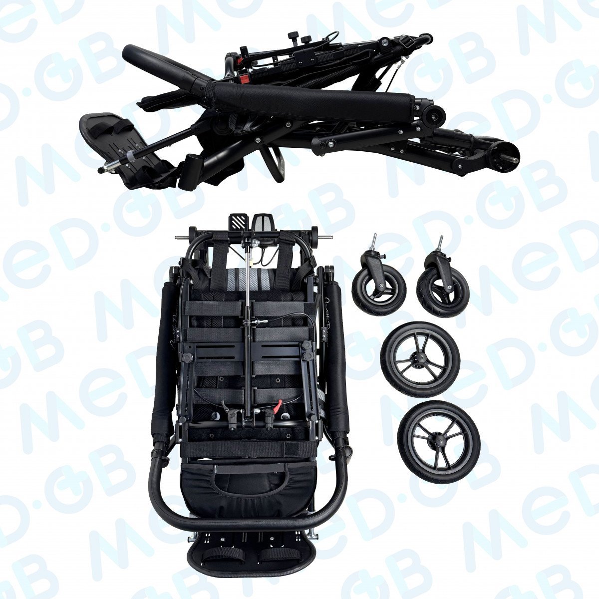 Благодаря специальной конструкции сиденья, состоящего из эластичных лент, можно регулировать жесткость. Сиденье и спинка имеют широкий диапазон регулировок по углу наклона. Рама коляски складная. Для удобной транспортировки коляски в автомобиле задние и передние колёса быстросъёмные. Для плавности хода подвеска задних колёс оснащена амортизаторами.