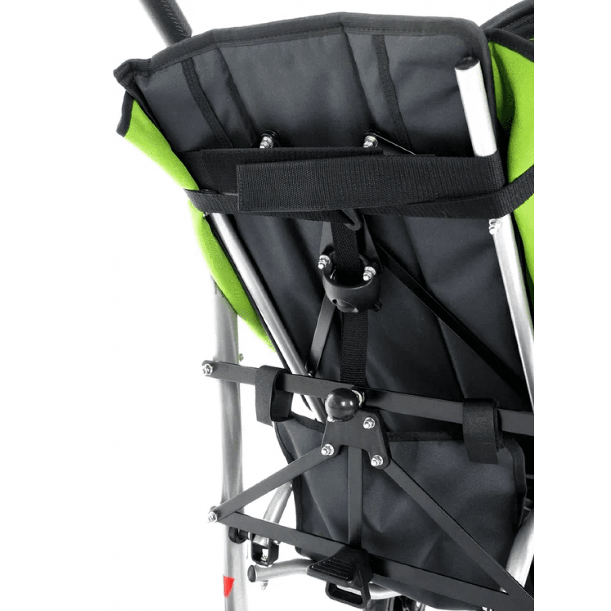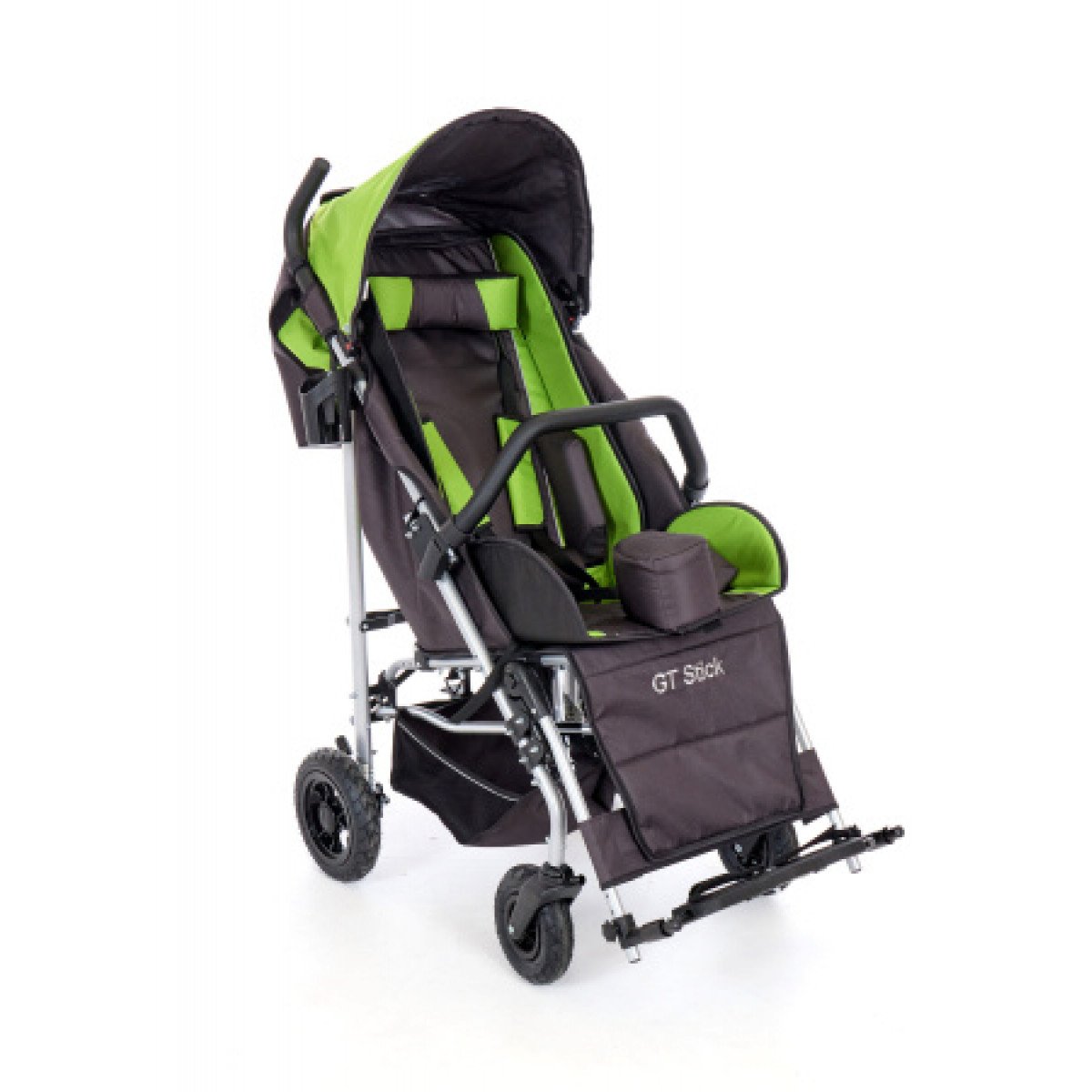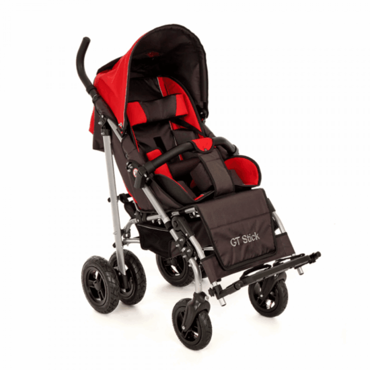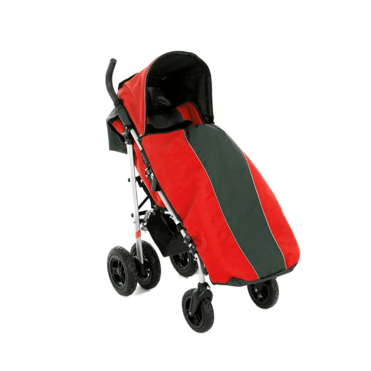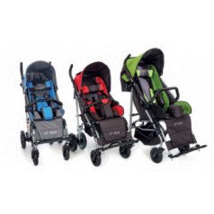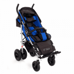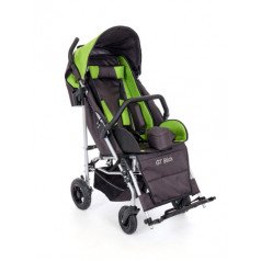 Коляска легко адаптируется под ребёнка: спинка регулируется по углу наклона, есть подголовник с фиксацией, боковые поддержки и абдуктор для правильного положения тела. Сиденье выполнено из прочного материала со съёмной обивкой — за ним проще ухаживать. Подножки регулируются по длине и оснащены ремнями для фиксации ног.