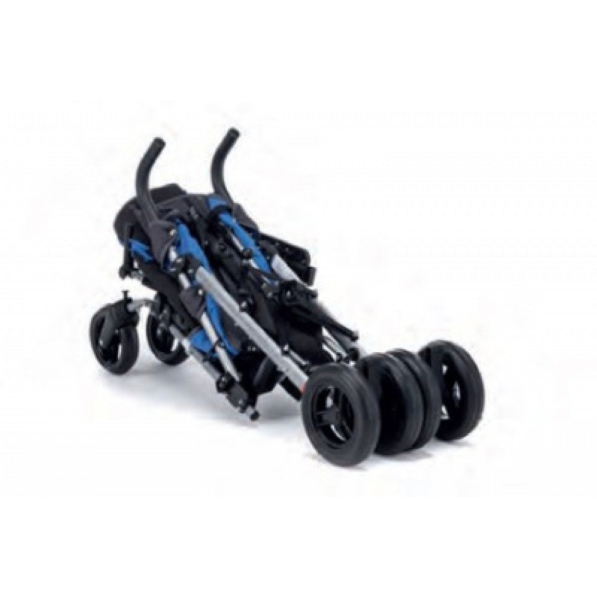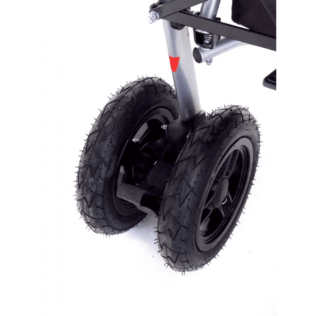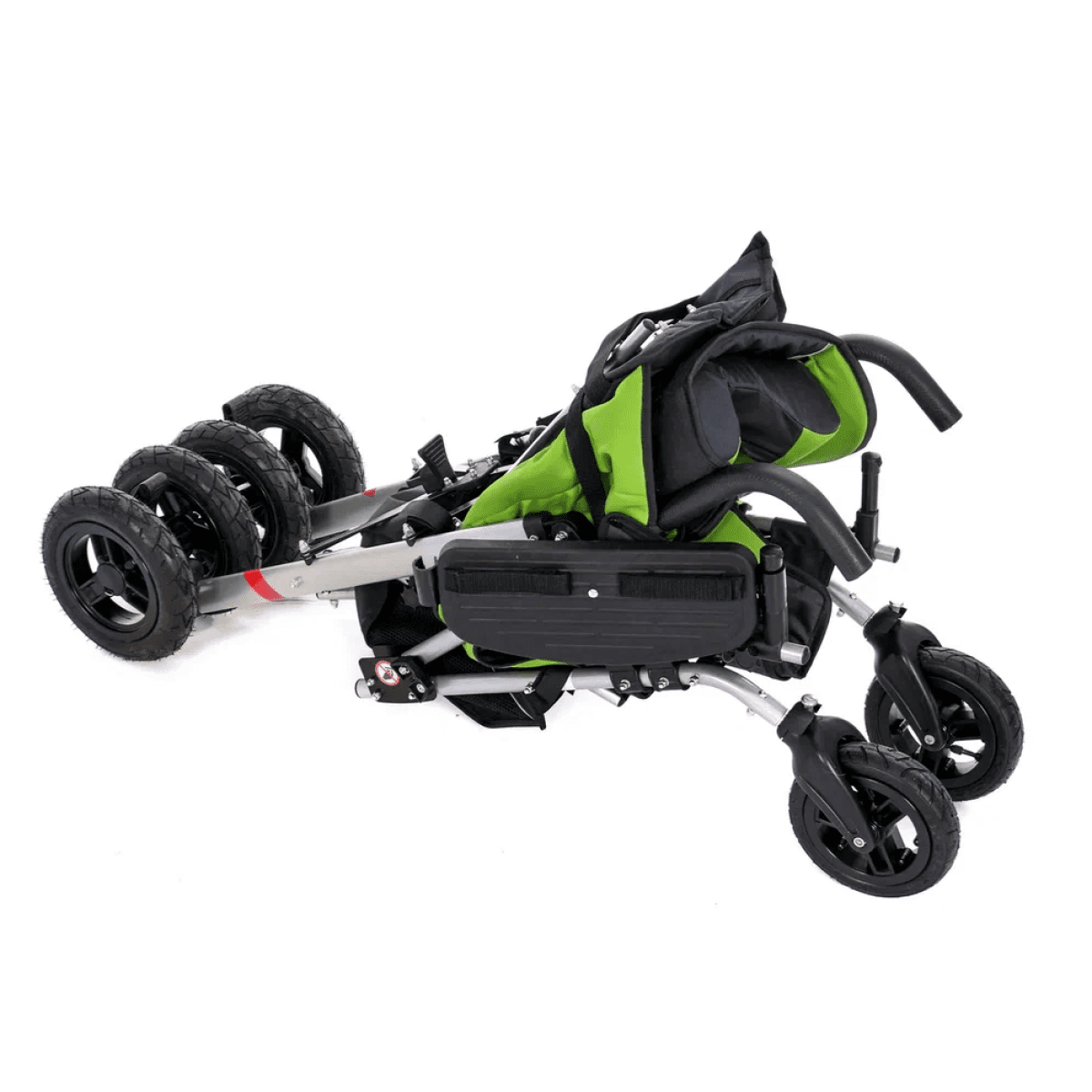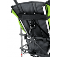 Для безопасности предусмотрены пятиточечный ремень и защитный поручень. Сдвоенные задние колёса с тормозами обеспечивают устойчивость, а передние — манёвренность и возможность фиксации направления.