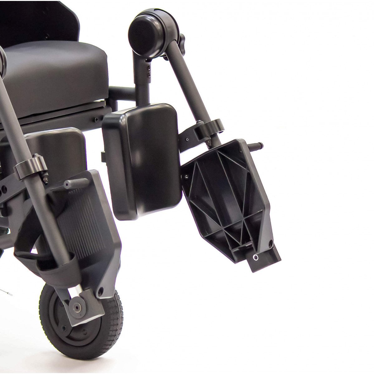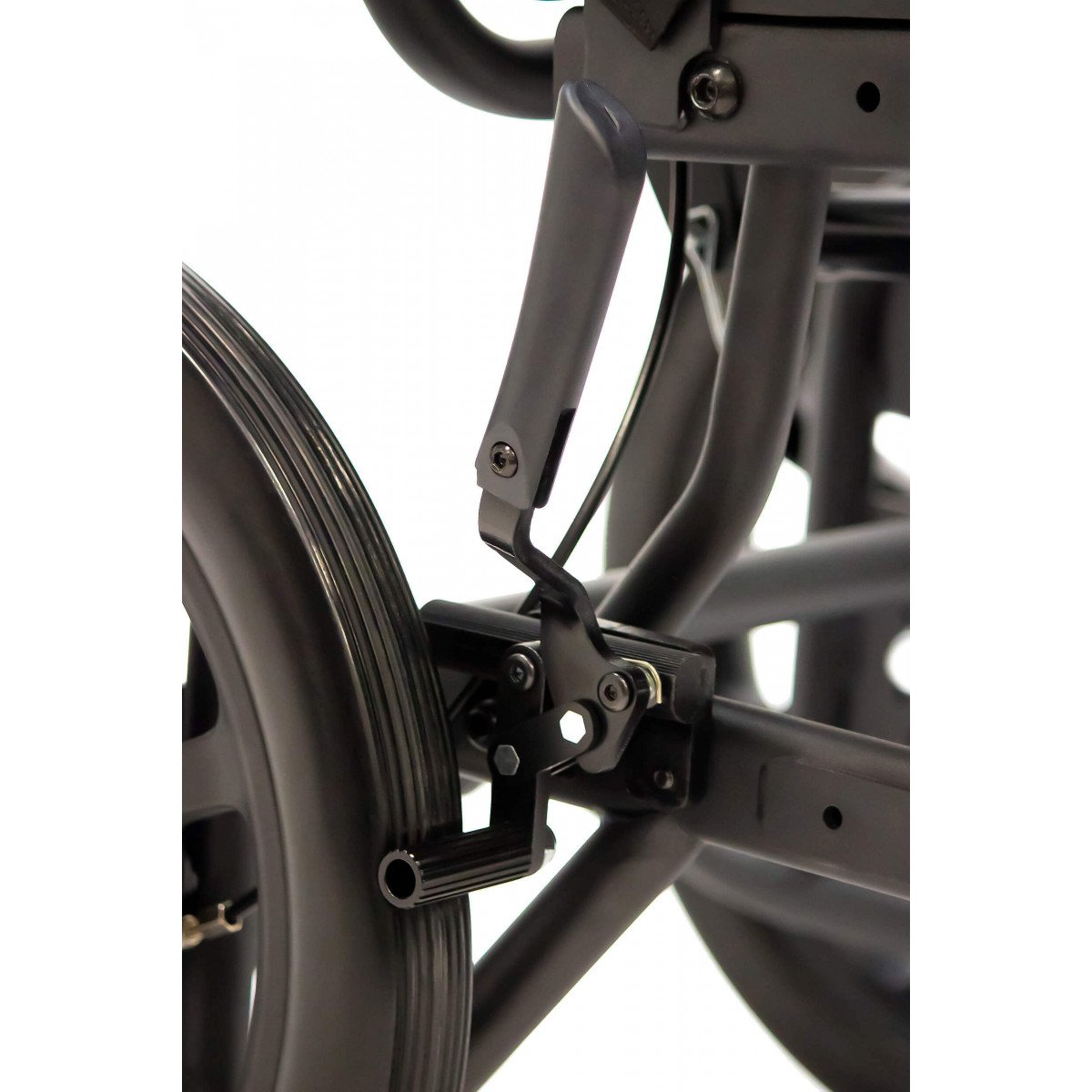 Задние литые колёса отвечают за надёжность и устойчивость на дороге, а передние пневматические — смягчают неровности и упрощают управление. Коляска оснащена боковыми стояночными тормозами и дополнительным управлением тормозами на ручках для сопровождающего. Антиопрокидыватели повышают устойчивость и делают передвижение безопаснее.
