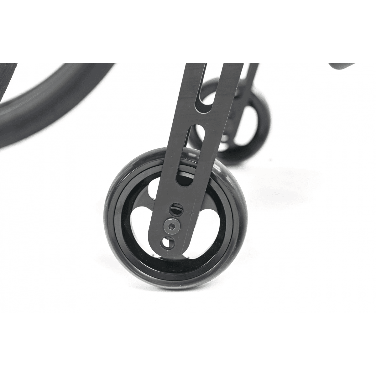 - Передние поворотные колёса оснащены цельнорезиновыми покрышками и обладают тремя позициями регулировки высоты
