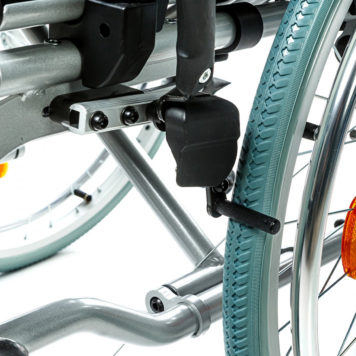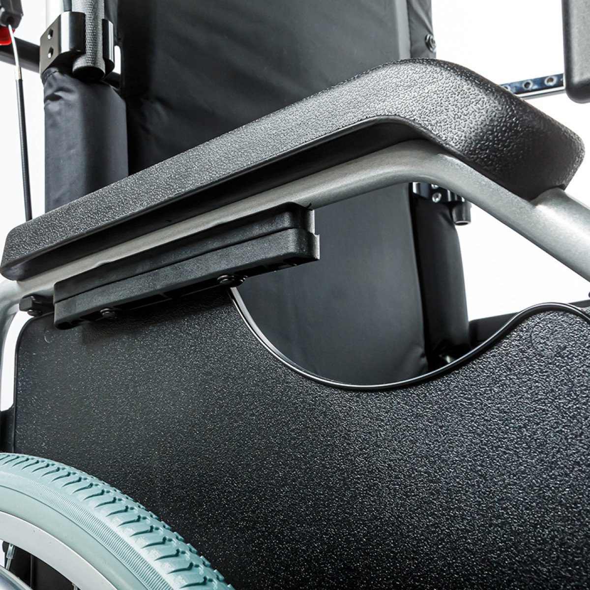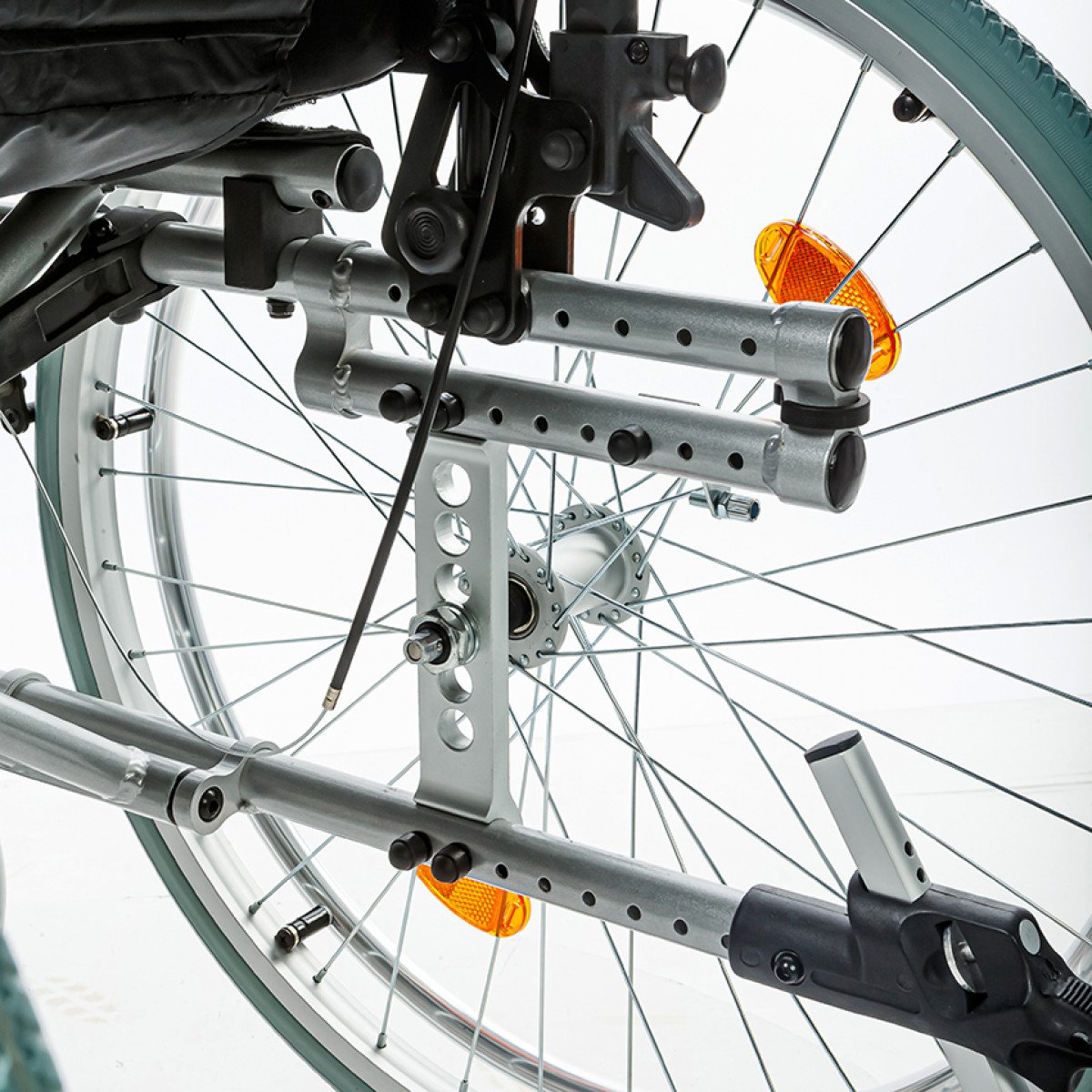 Рама выполнена из алюминиевого сплава с антикоррозийным покрытием, что обеспечивает прочность и долговечность. Передние и задние колёса доступны в вариантах: цельнолитые или пневматические — под разные условия эксплуатации. Для устойчивости предусмотрены антиопрокидыватели с регулировкой по высоте, которые при необходимости можно снять.