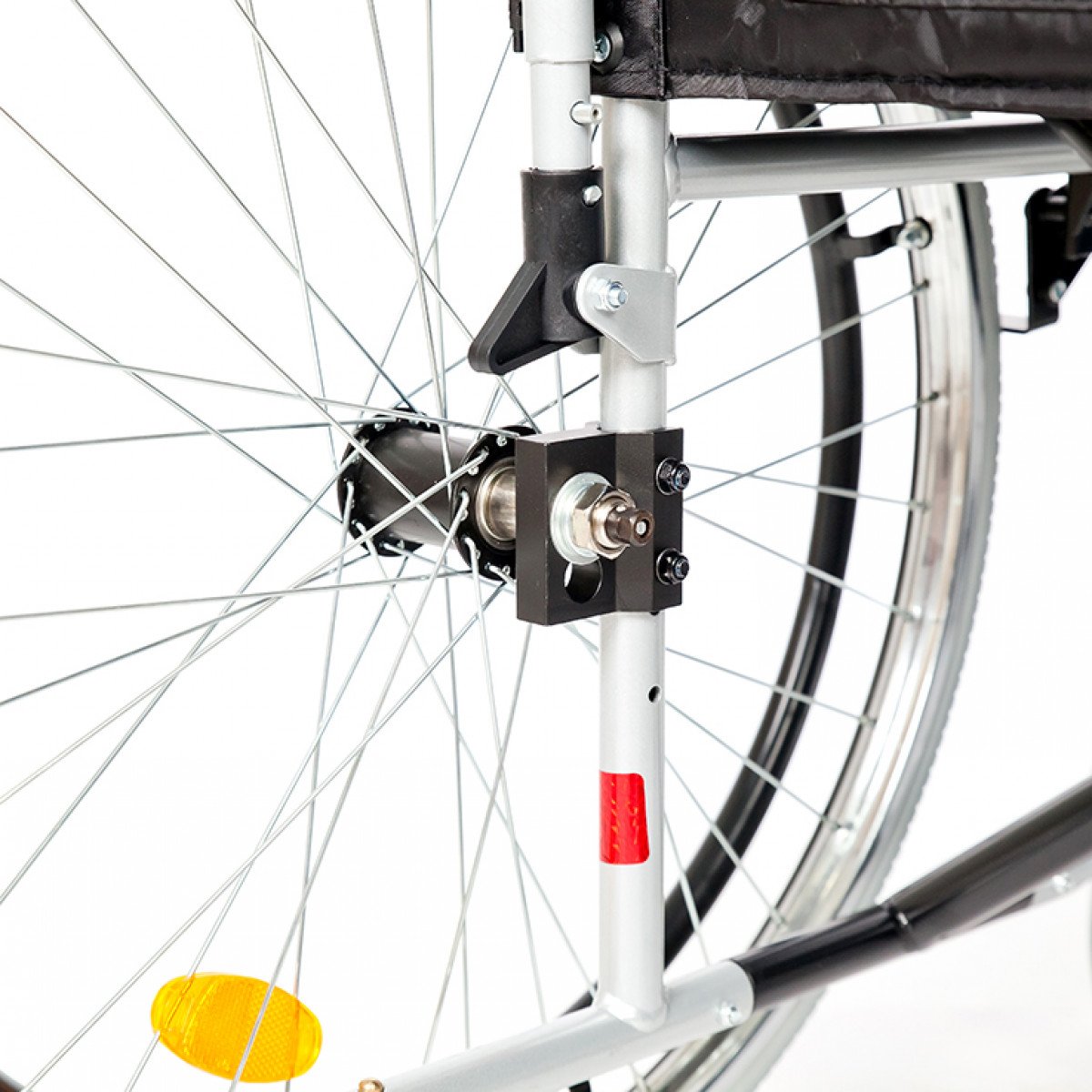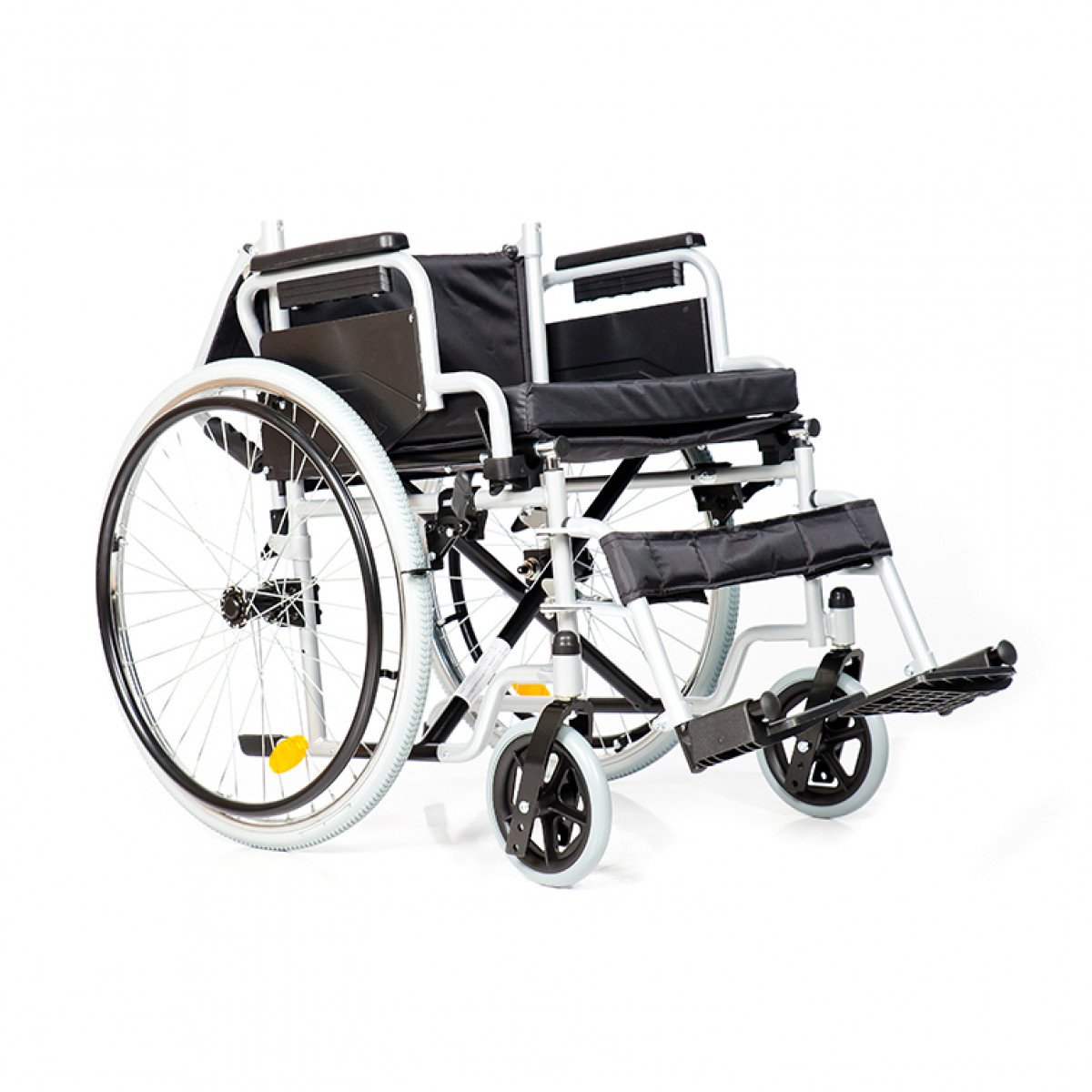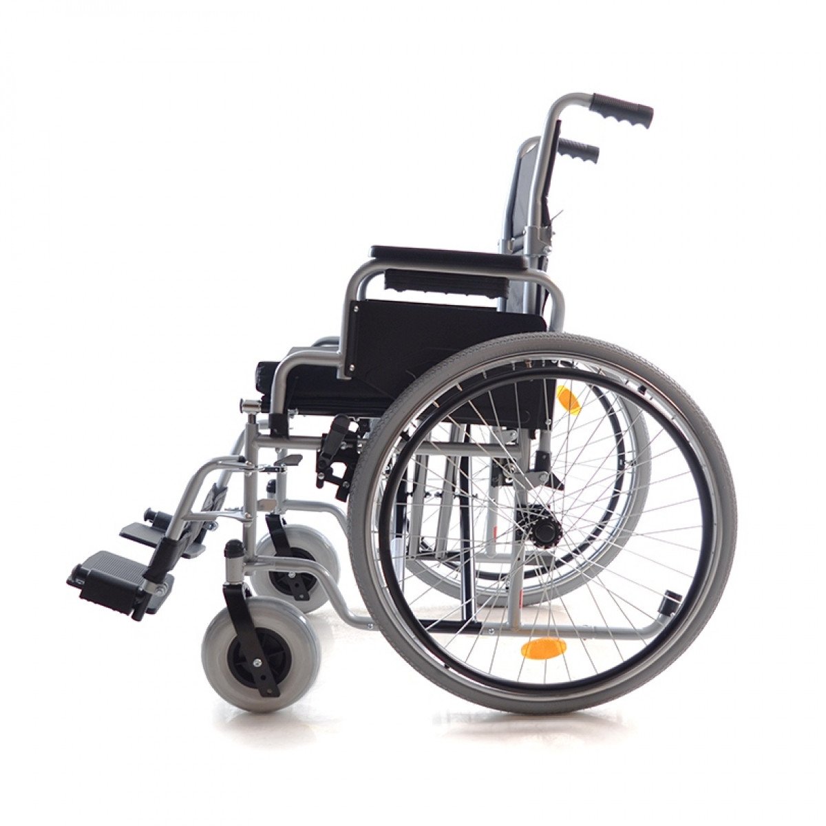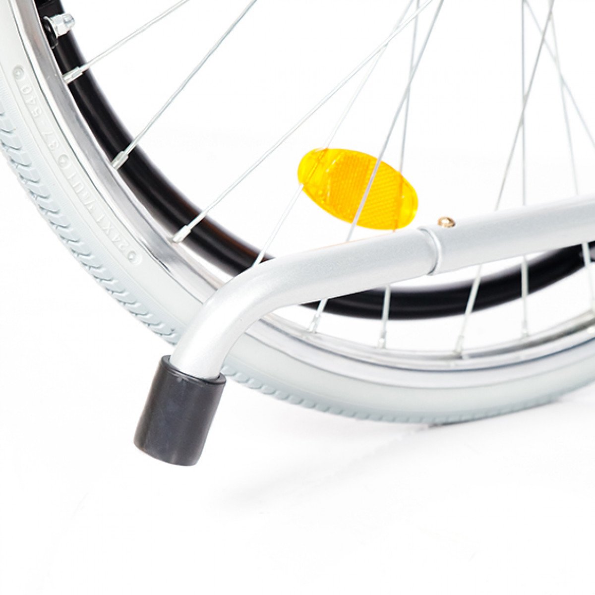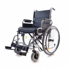 Рама выполнена из стальных труб с антикоррозийным покрытием — это про прочность и долговечность. Передние и задние колёса доступны в вариантах: цельнолитые или пневматические, что позволяет выбрать конфигурацию под условия использования. Задние колёса быстросъёмные и регулируются по высоте с помощью адаптера. Для безопасности предусмотрены стояночные тормоза и антиопрокидыватель с резиновым наконечником, который повышает устойчивость коляски.