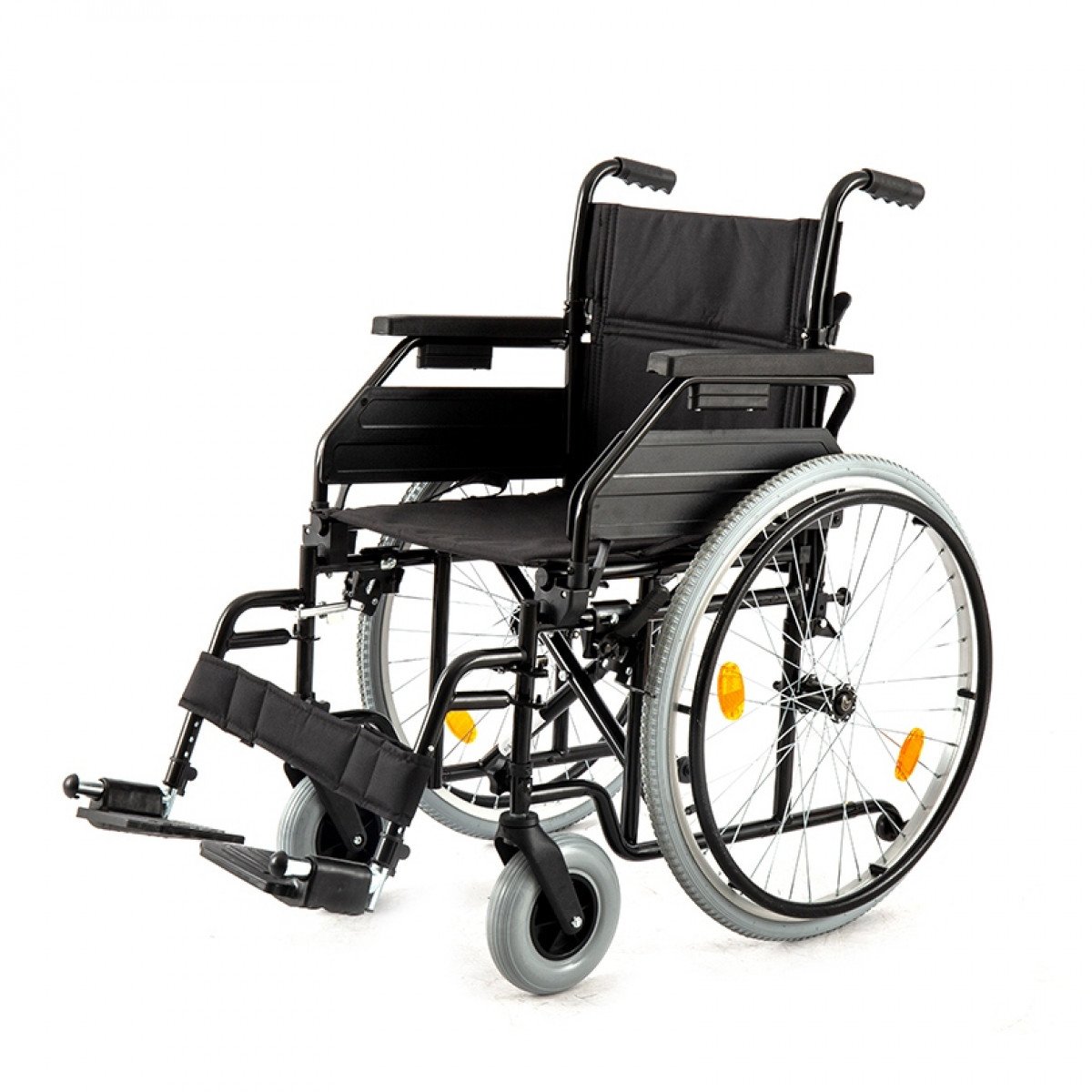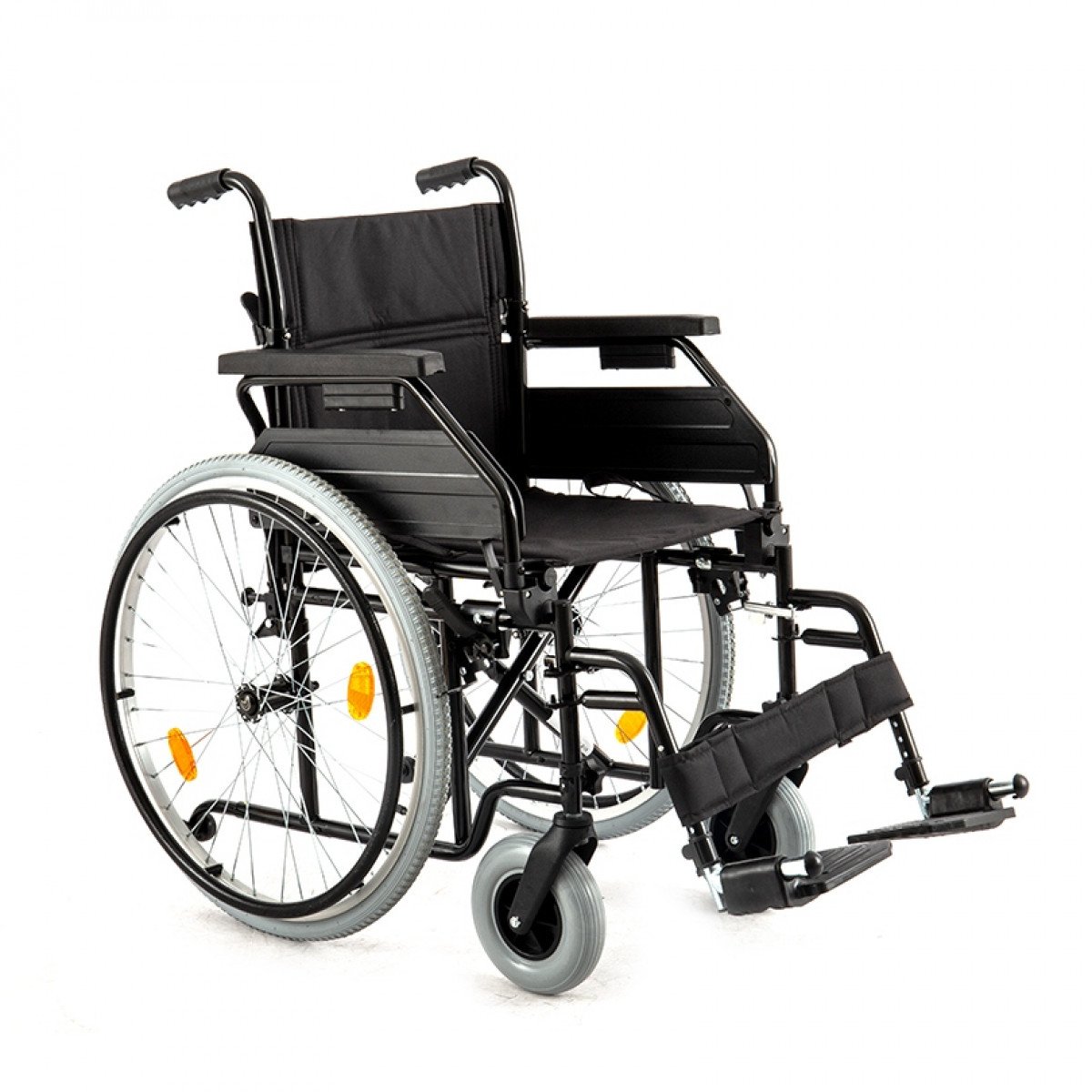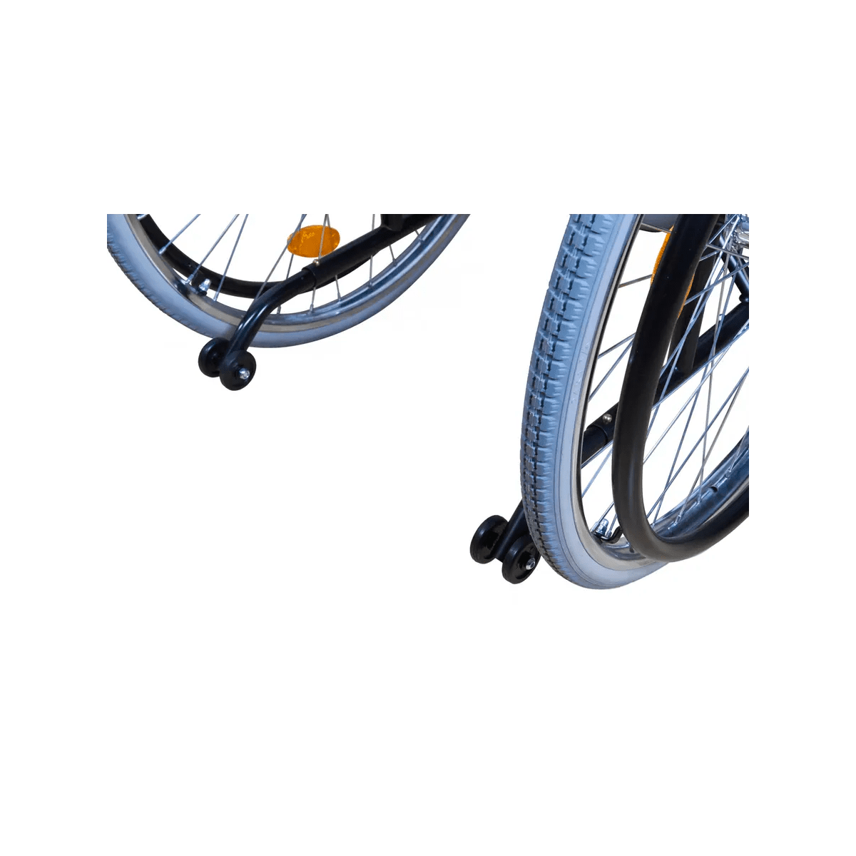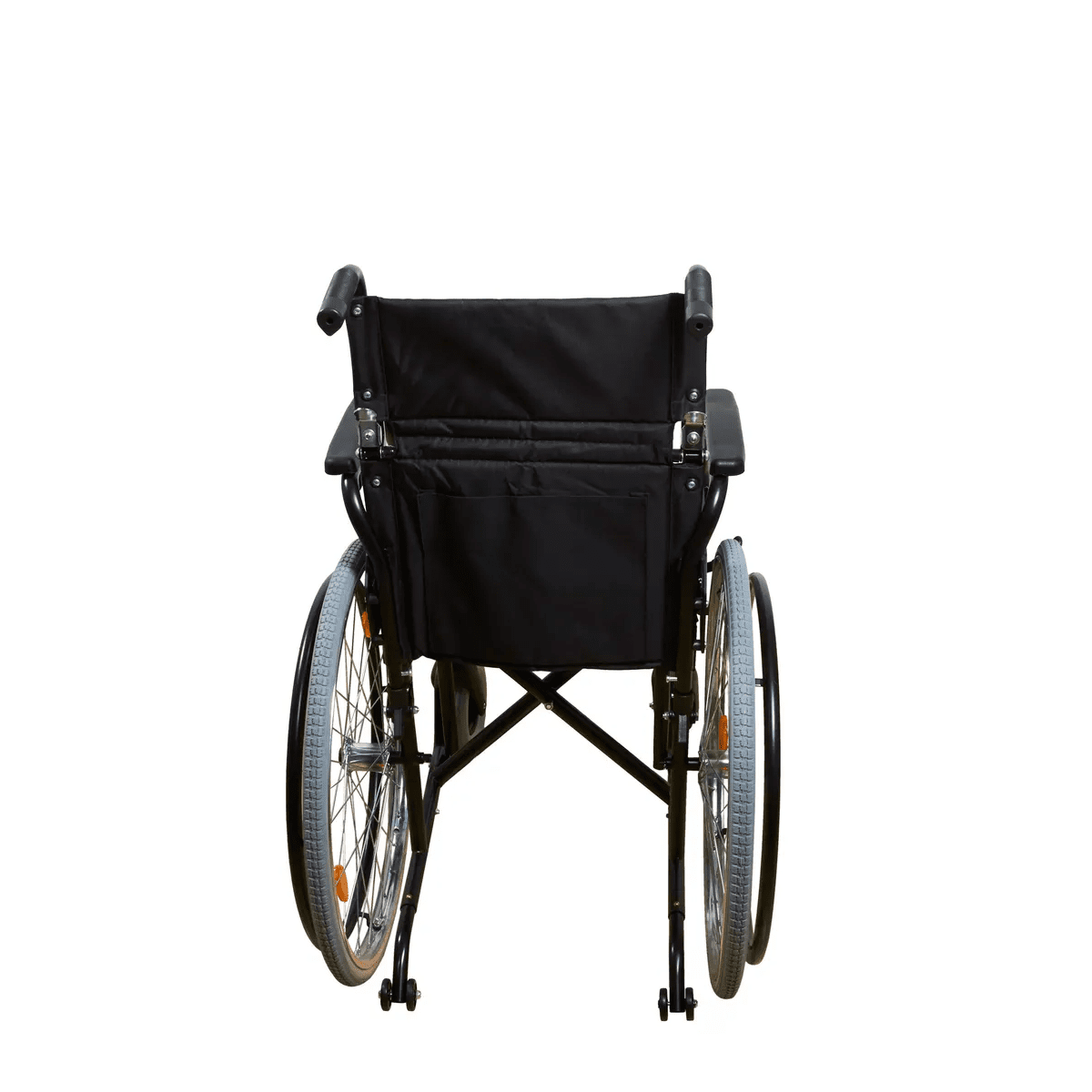 Рама выполнена из стальных труб с антикоррозийным покрытием — это про прочность и долгий срок службы. Коляска складывается без инструментов, а складная спинка помогает уменьшить габариты при хранении. Доступны варианты колёс: цельнолитые или пневматические — под разные условия использования. Для устойчивости предусмотрен антиопрокидыватель с резиновым наконечником, который делает передвижение безопаснее.