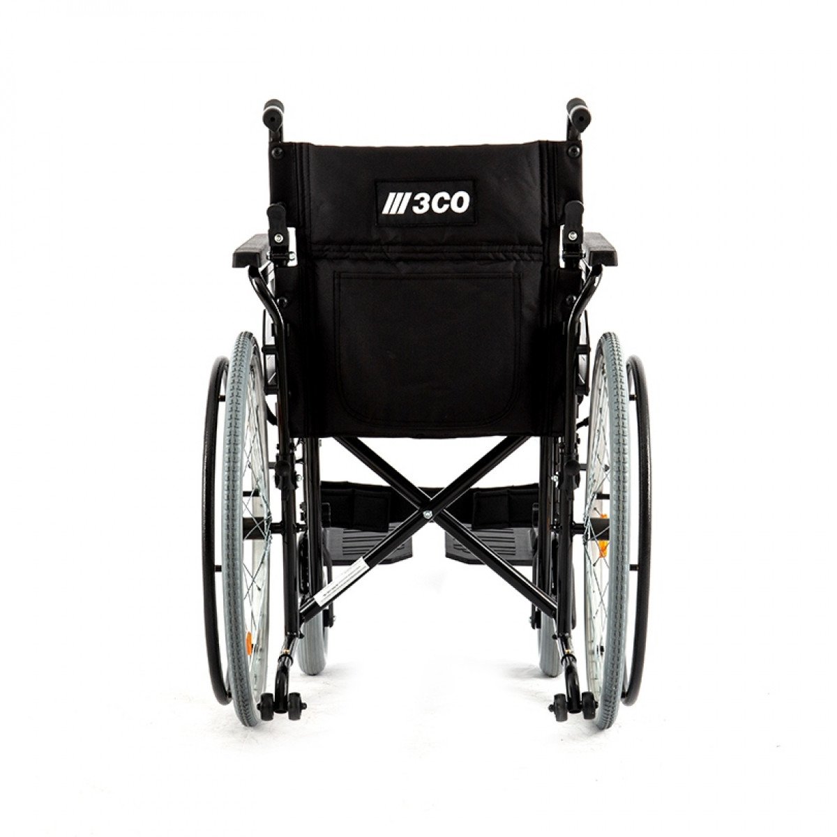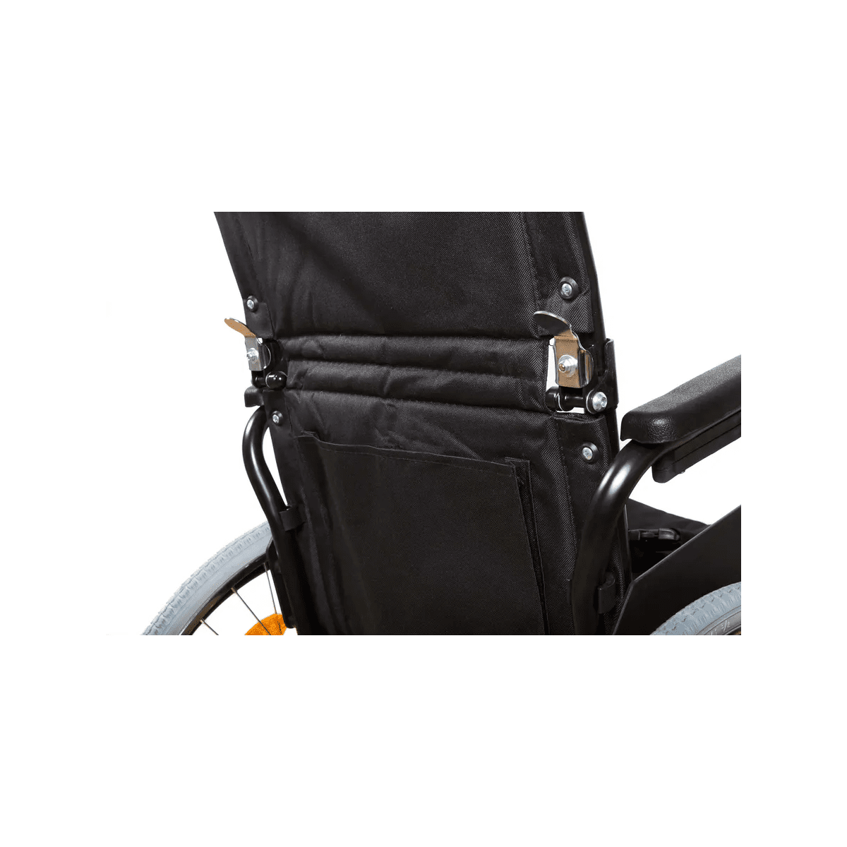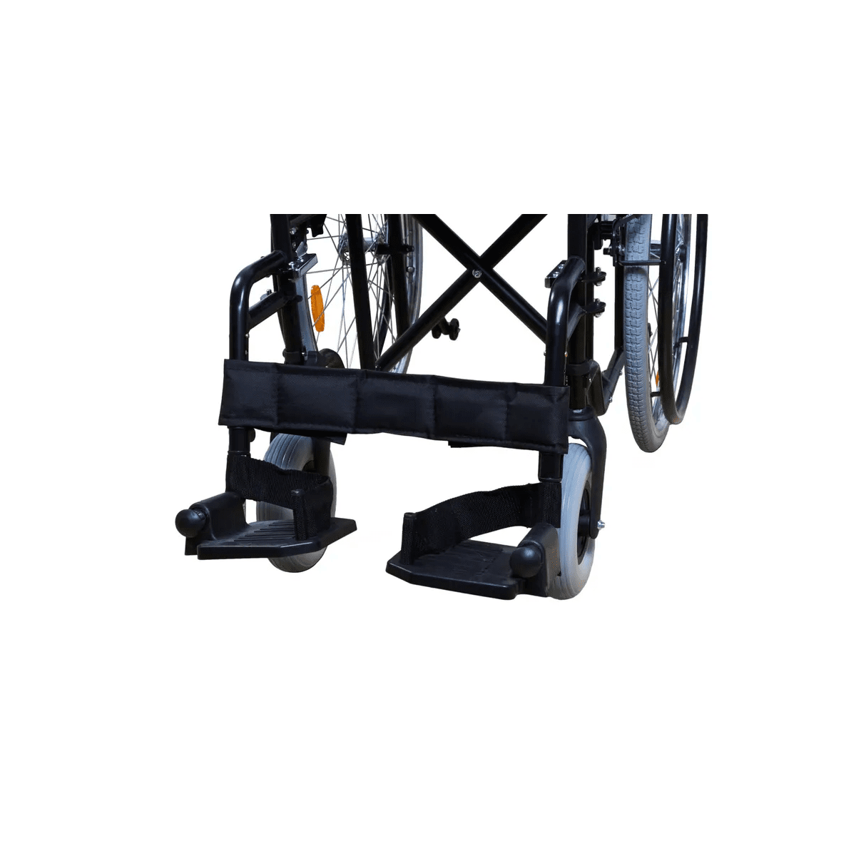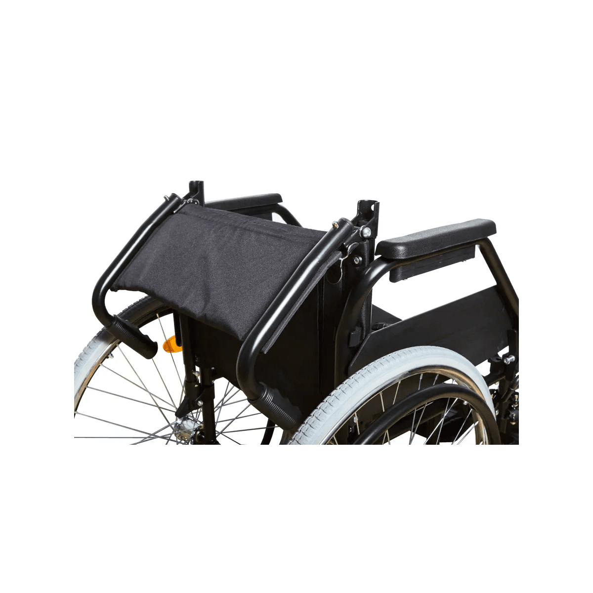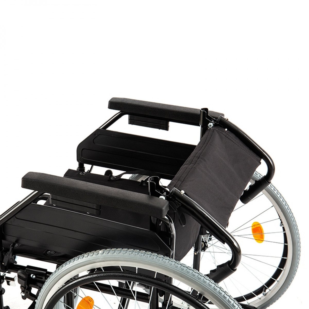Рама выполнена из стальных труб с антикоррозийным покрытием — это про прочность и долгий срок службы. Коляска складывается без инструментов, а складная спинка помогает уменьшить габариты при хранении. Доступны варианты колёс: цельнолитые или пневматические — под разные условия использования. Для устойчивости предусмотрен антиопрокидыватель с резиновым наконечником, который делает передвижение безопаснее.
