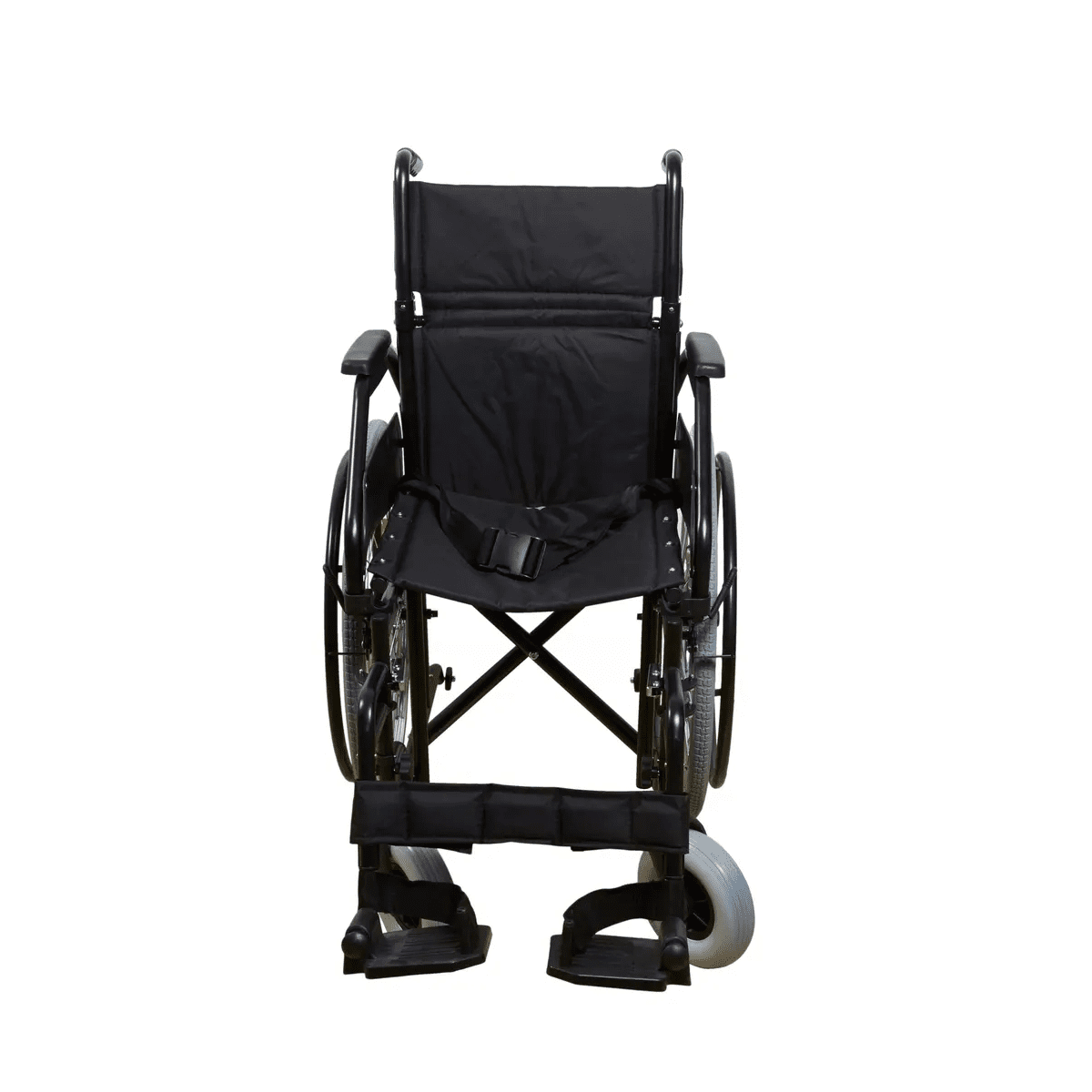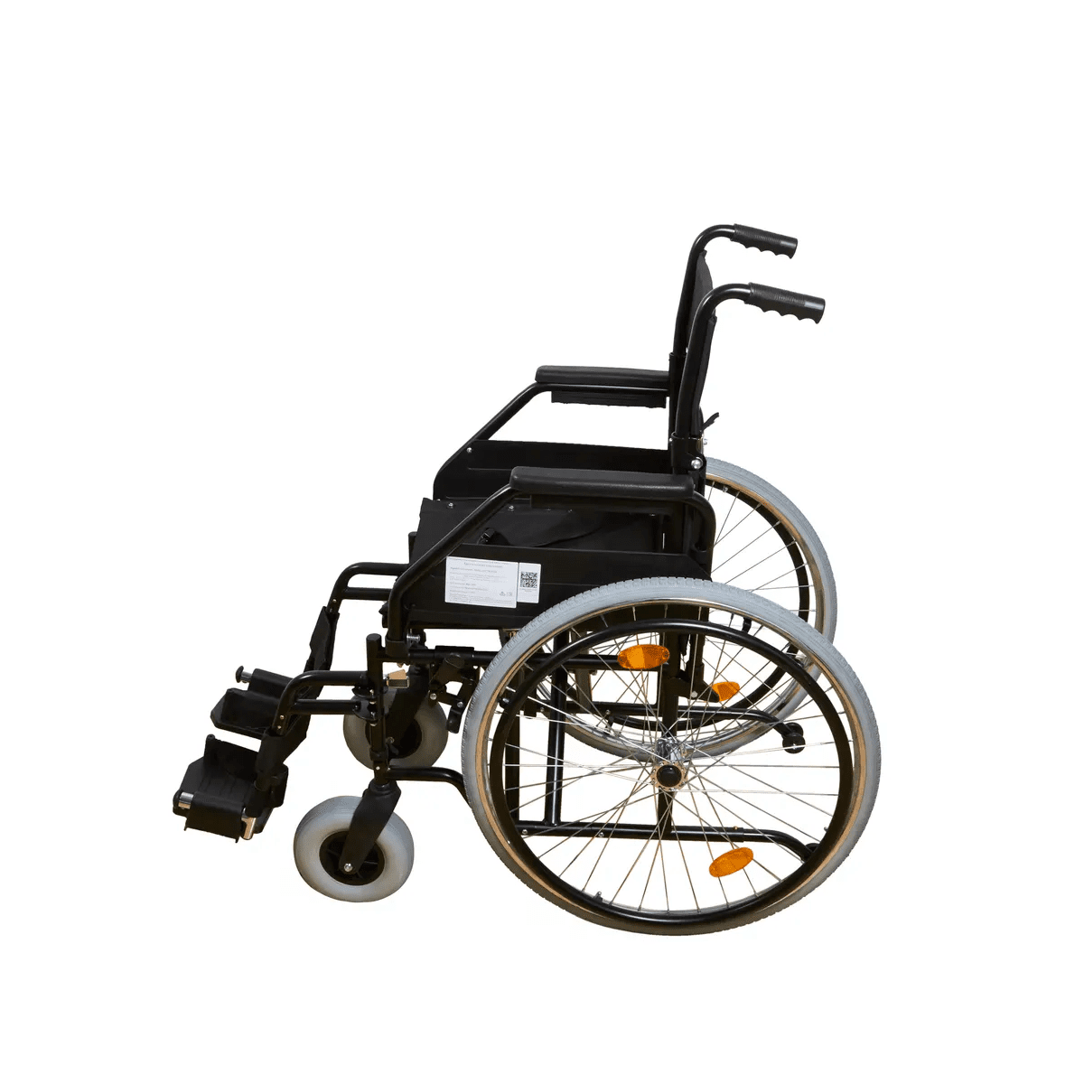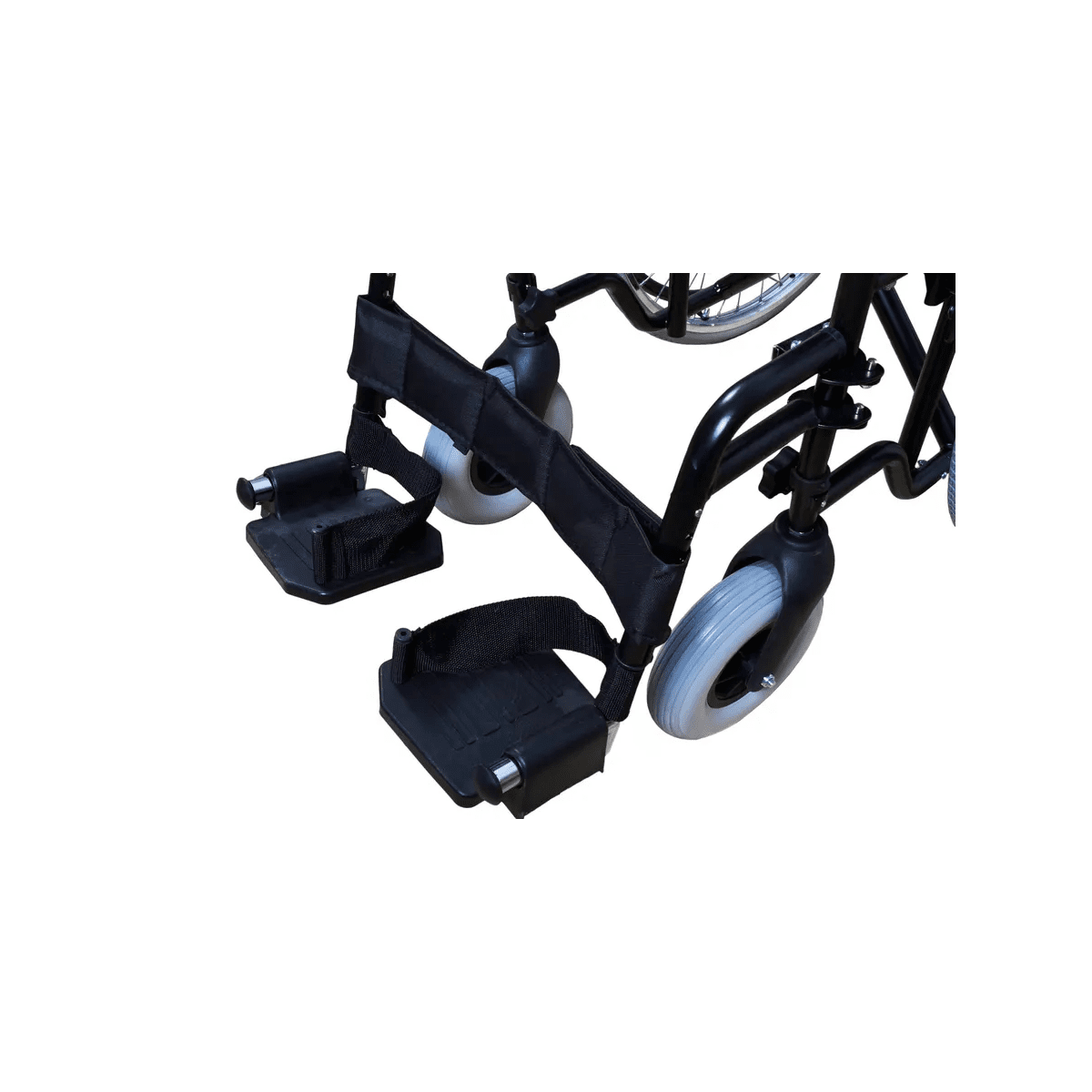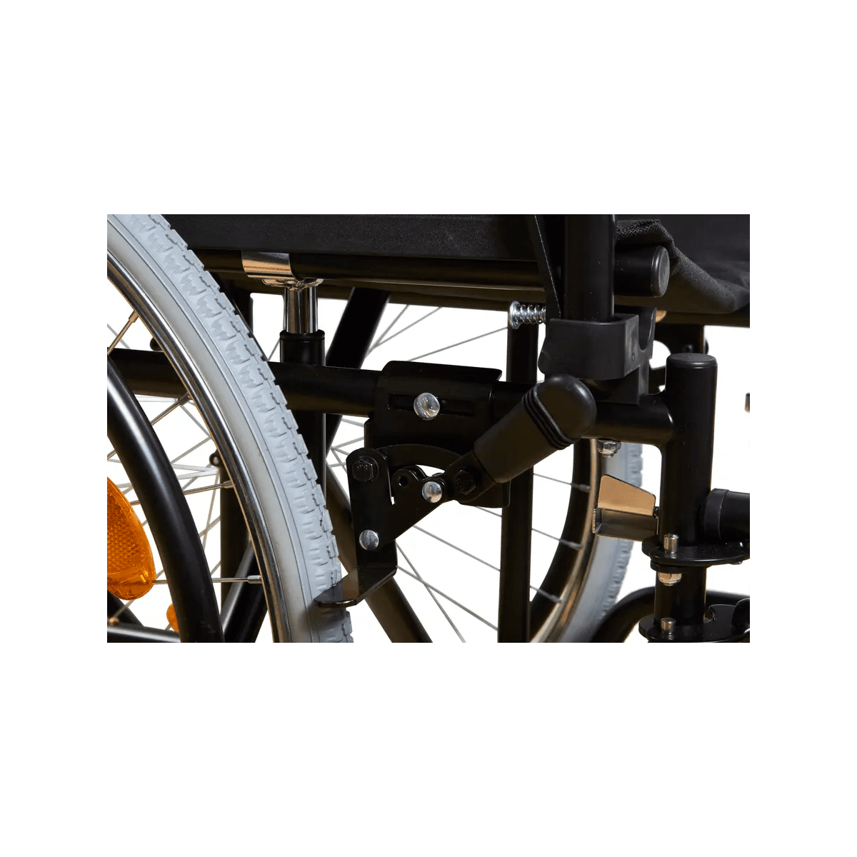 Рама выполнена из стальных труб с антикоррозийным покрытием — это про прочность и долгий срок службы. Коляска складывается без инструментов, а складная спинка помогает уменьшить габариты при хранении. Доступны варианты колёс: цельнолитые или пневматические — под разные условия использования. Для устойчивости предусмотрен антиопрокидыватель с резиновым наконечником, который делает передвижение безопаснее.