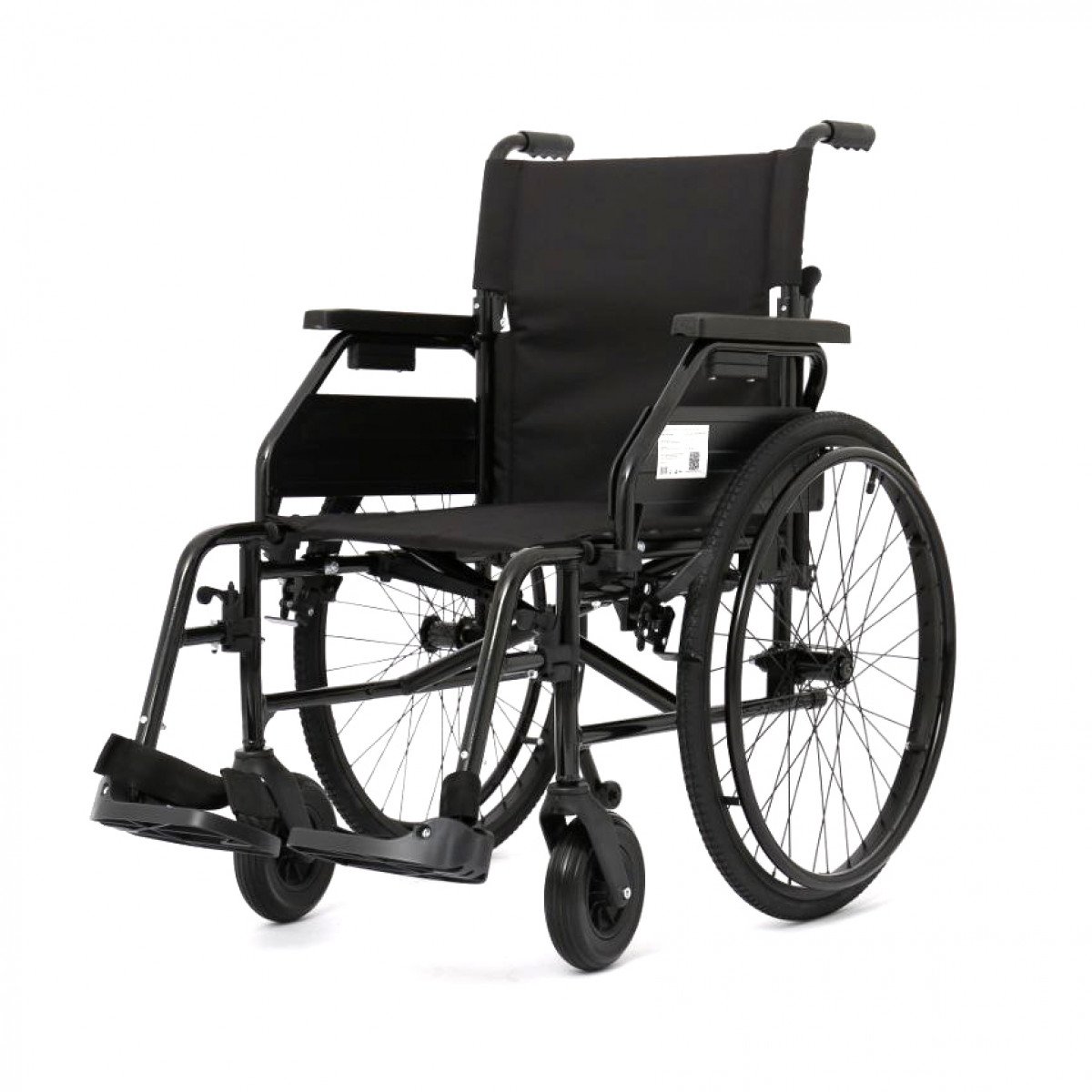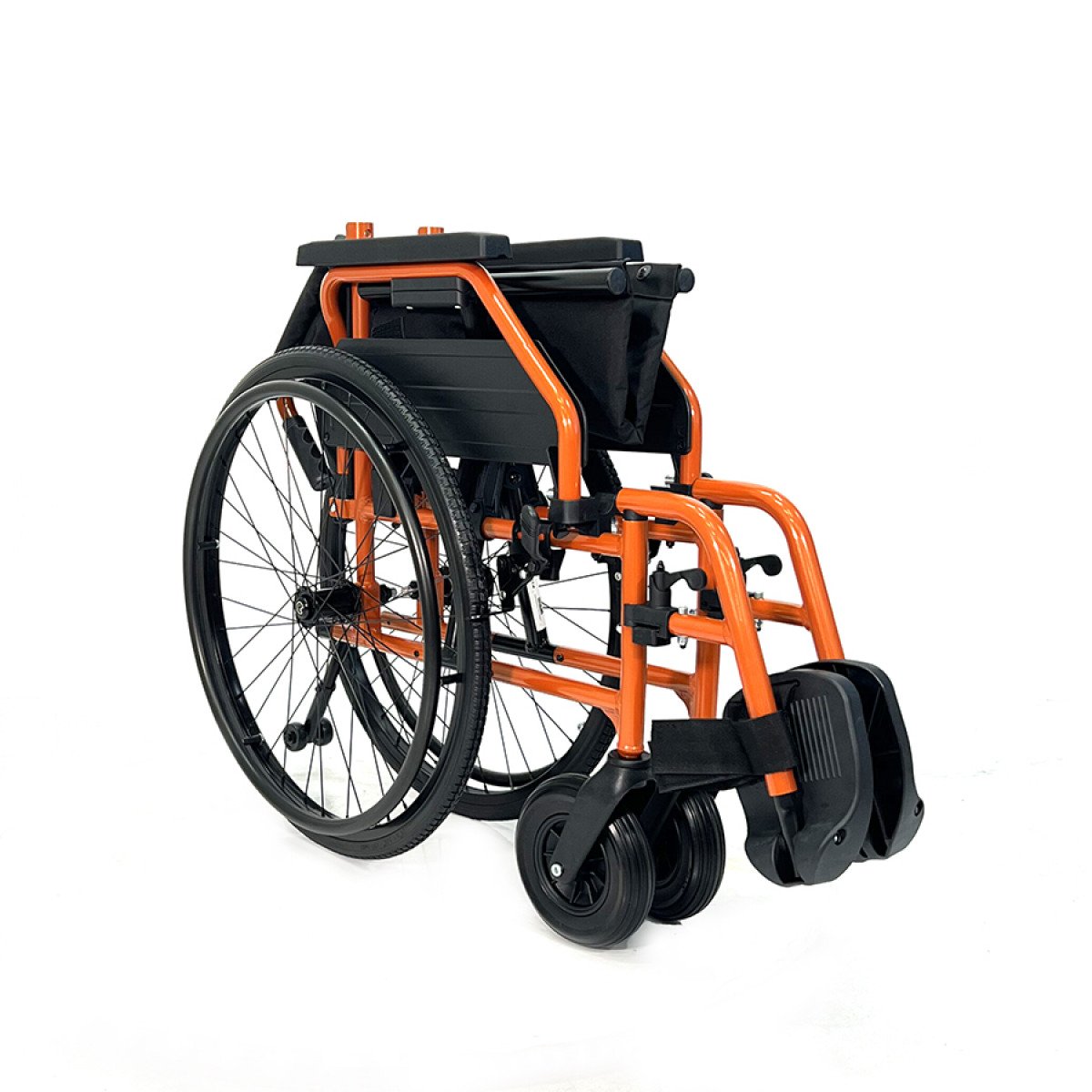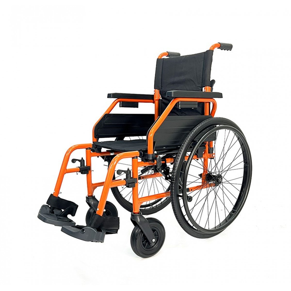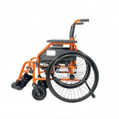 Рама выполнена из стальных труб с антикоррозийным покрытием — это про прочность и долговечность. Коляска складывается без инструментов, спинка также складная, что упрощает хранение и перевозку. Подлокотники откидываются и регулируются по высоте с помощью проставок, облегчая пересаживание и позволяя настроить удобную посадку. Подножки — съёмно-откидные, с регулировкой угла наклона, а ложементы под голени настраиваются по высоте для более правильного положения ног.