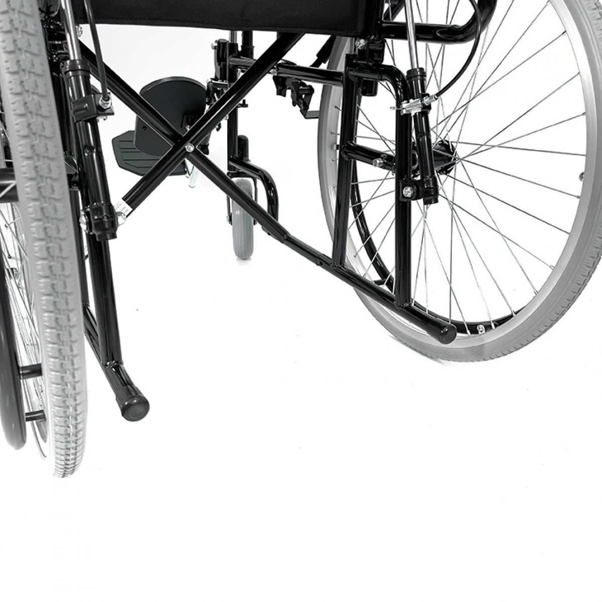 Коляска выполнена на прочной стальной раме, что даёт надёжность при регулярной эксплуатации. Регулируемые элементы помогают подобрать удобное положение корпуса и снизить нагрузку при длительном сидении. Цельнолитые колёса не требуют обслуживания и обеспечивают устойчивость на разных покрытиях.