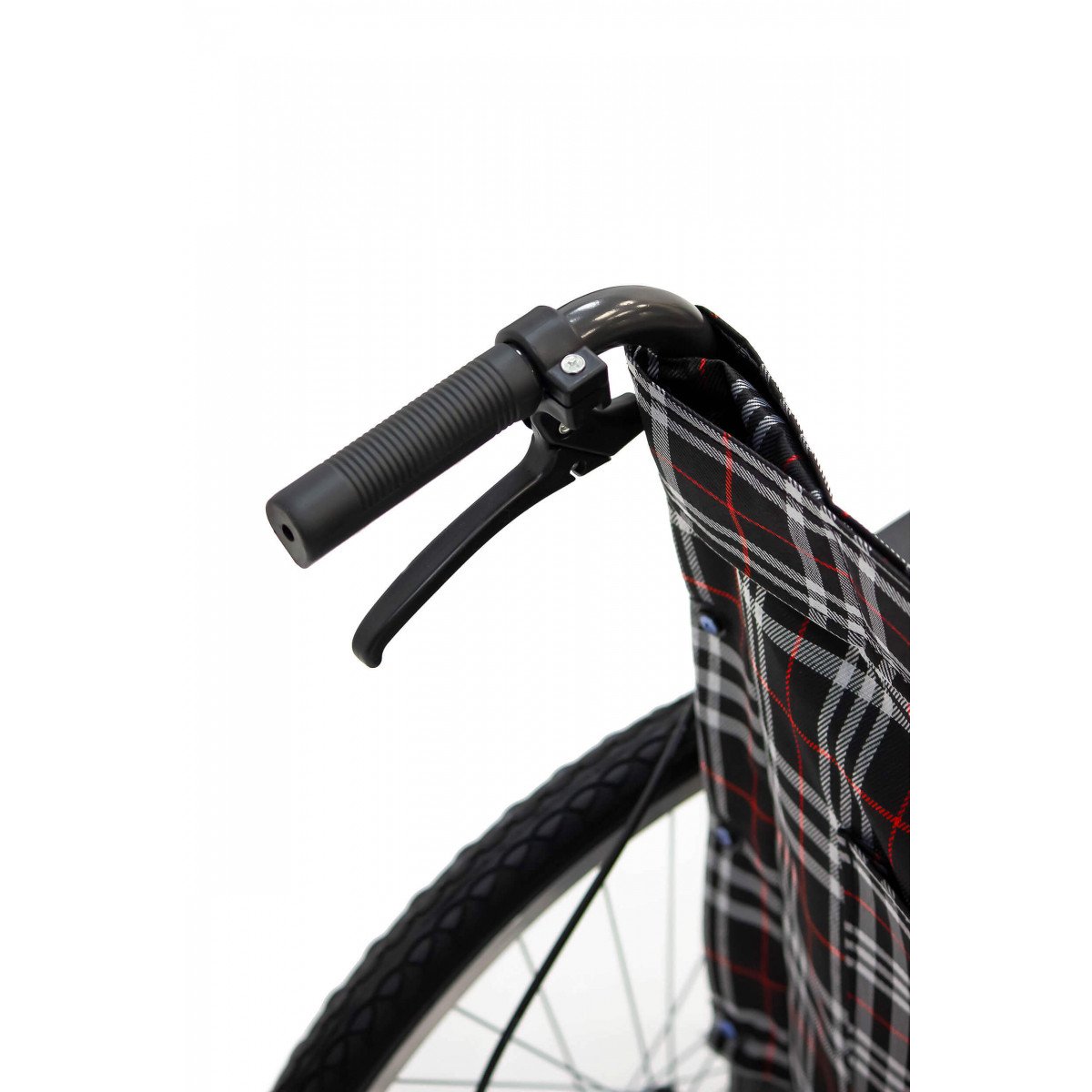 Конструкция простая и понятная в использовании. Сиденье выполнено из прочного полиэстера с водоотталкивающей пропиткой, подлокотники мягкие, а подножки регулируются по длине голени и дополняются поднимающимися опорами. Это позволяет настроить посадку и обеспечить комфортное положение пользователя. Рифлёные приводные обода упрощают управление, особенно если сила в руках снижена.
