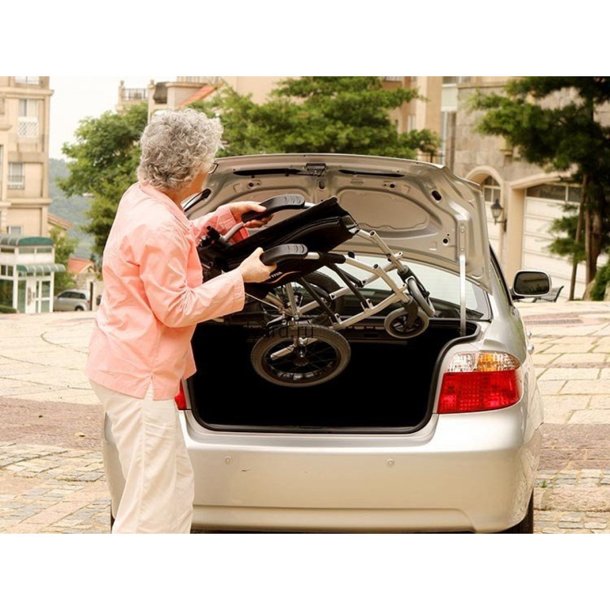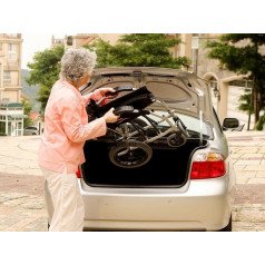 Лёгкая алюминиевая рама снижает нагрузку при подъёме и переноске. Задние колёса и подножки снимаются, поэтому коляску проще сложить, убрать в багажник или хранить дома. Откидные подножки помогают быстрее пересадить пользователя и не мешают при движении. Складная конструкция экономит место и делает модель практичной для поездок.