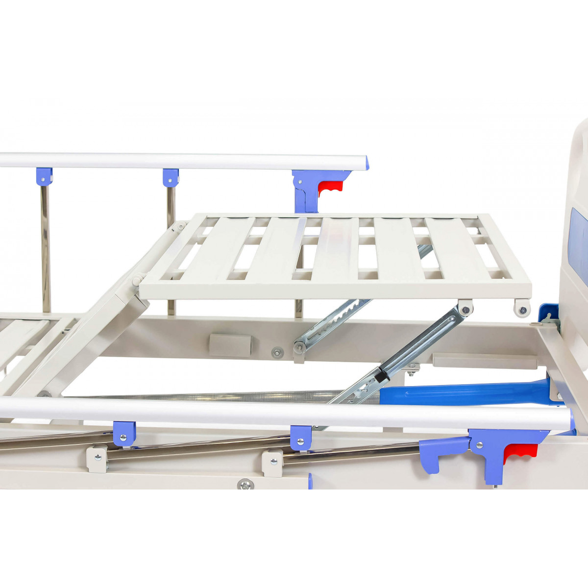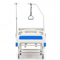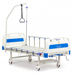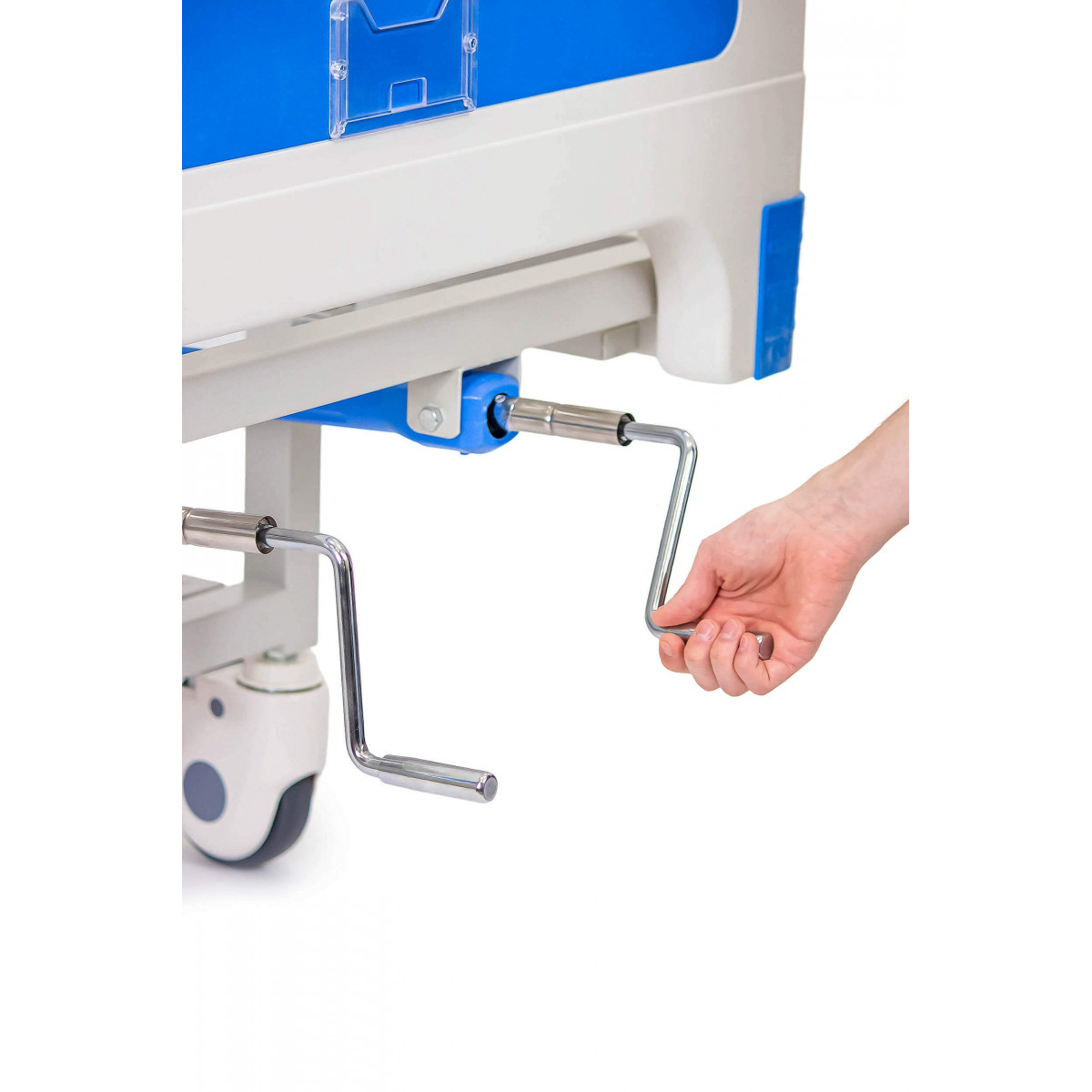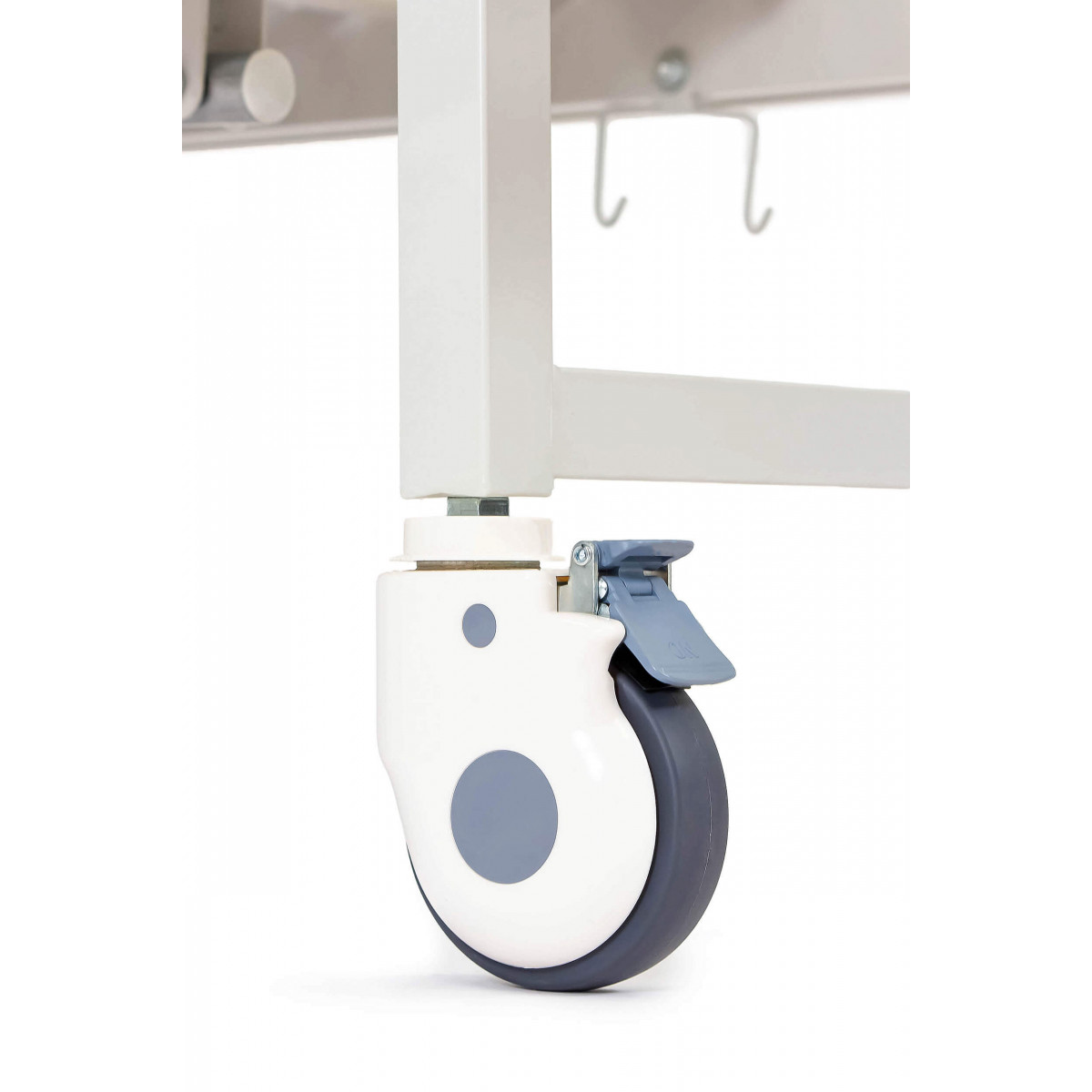 Кровать оснащена устойчивыми колёсами с индивидуальными тормозами, что удобно при перемещении и фиксации. Конструкция рассчитана на ежедневную эксплуатацию и подходит как для медицинских учреждений, так и для домашнего ухода.