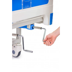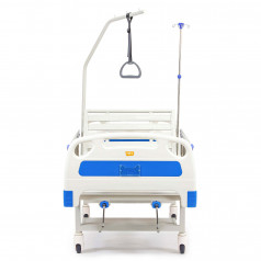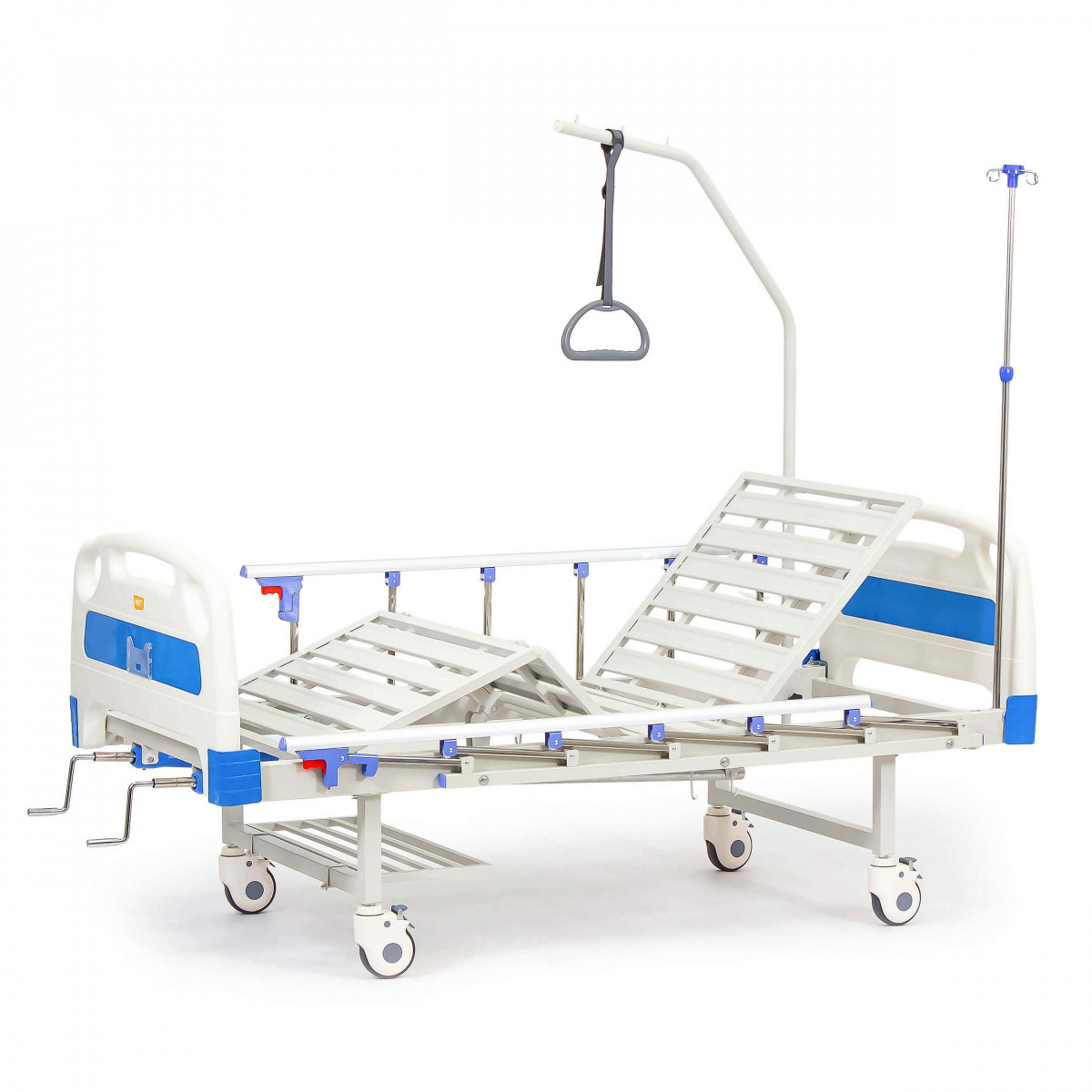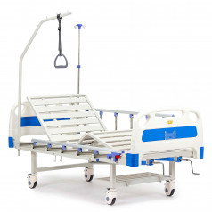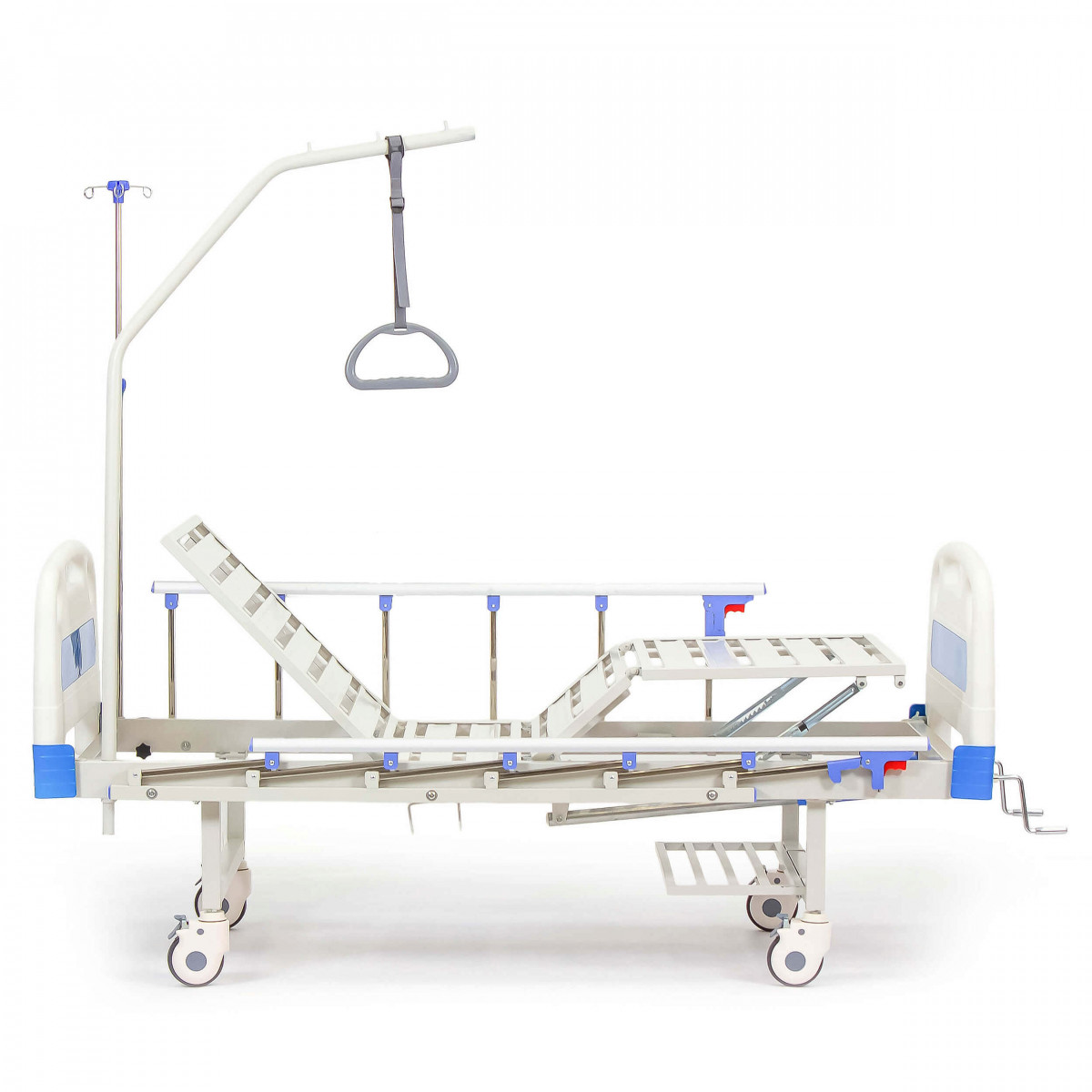 Кровать оснащена устойчивыми колёсами с индивидуальными тормозами, что удобно при перемещении и фиксации. Конструкция рассчитана на ежедневную эксплуатацию и подходит как для медицинских учреждений, так и для домашнего ухода.