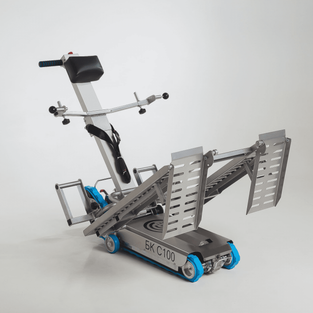 БК С100 прост в использовании и не требует сложной подготовки. Подъёмник быстро собирается, легко фиксируется к коляске и управляется с помощью интуитивно понятных кнопок движения вперёд и назад. Продуманная система фиксации и безопасности позволяет уверенно проходить лестничные пролёты. Зарядка аккумулятора выполняется быстро и удобно — достаточно подключить адаптер к основанию подъёмника.