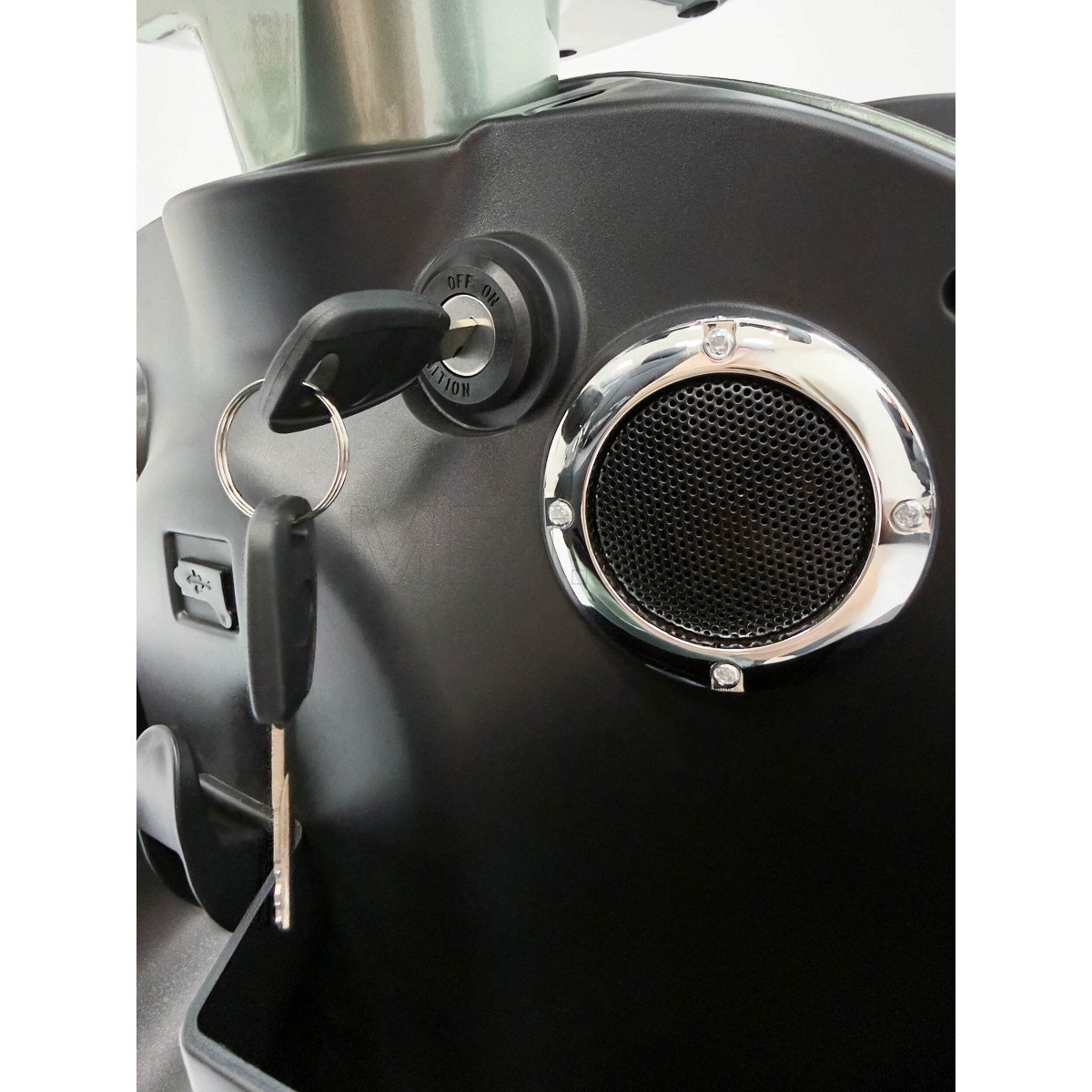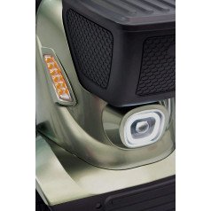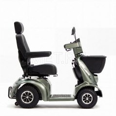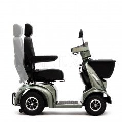 Модель создана для удобства и приятных поездок. В скутер встроены колонки с Bluetooth-подключением — можно слушать музыку или аудио во время движения. Съёмный аккумулятор легко заряжать отдельно, не перемещая сам скутер. Откидные подлокотники облегчают посадку и высадку, а сиденье регулируется по расстоянию до руля и углу наклона спинки, что помогает подобрать удобное положение.